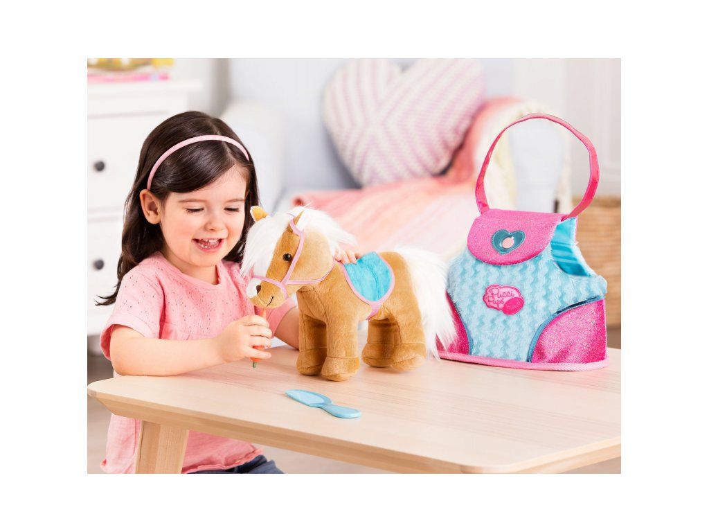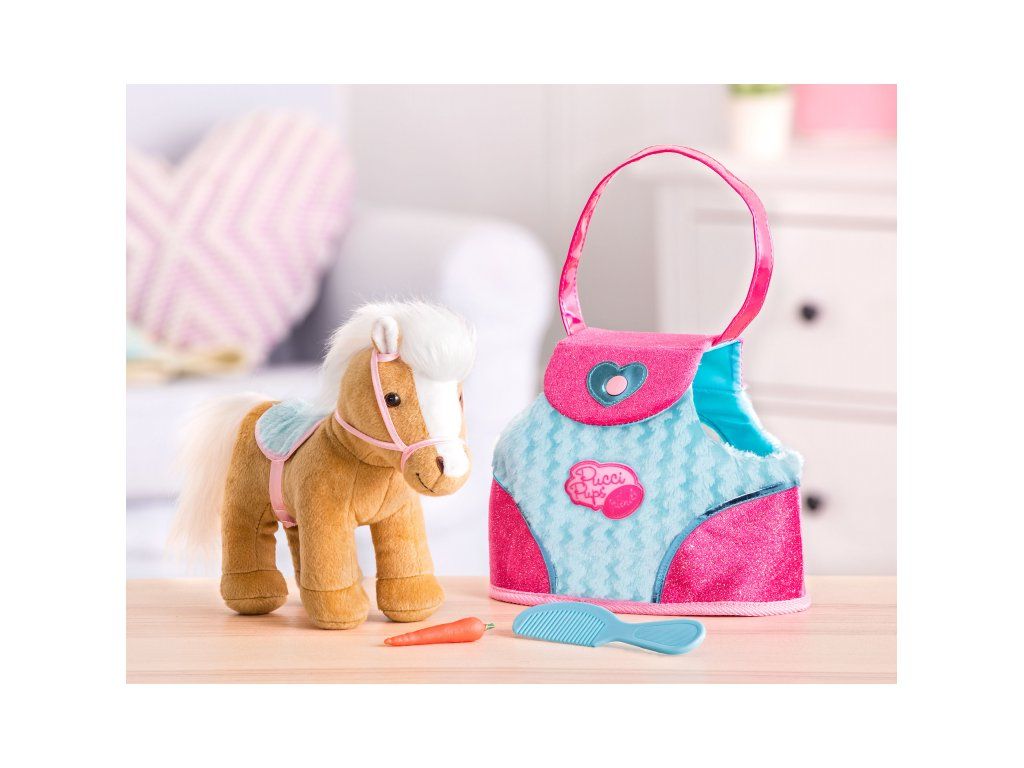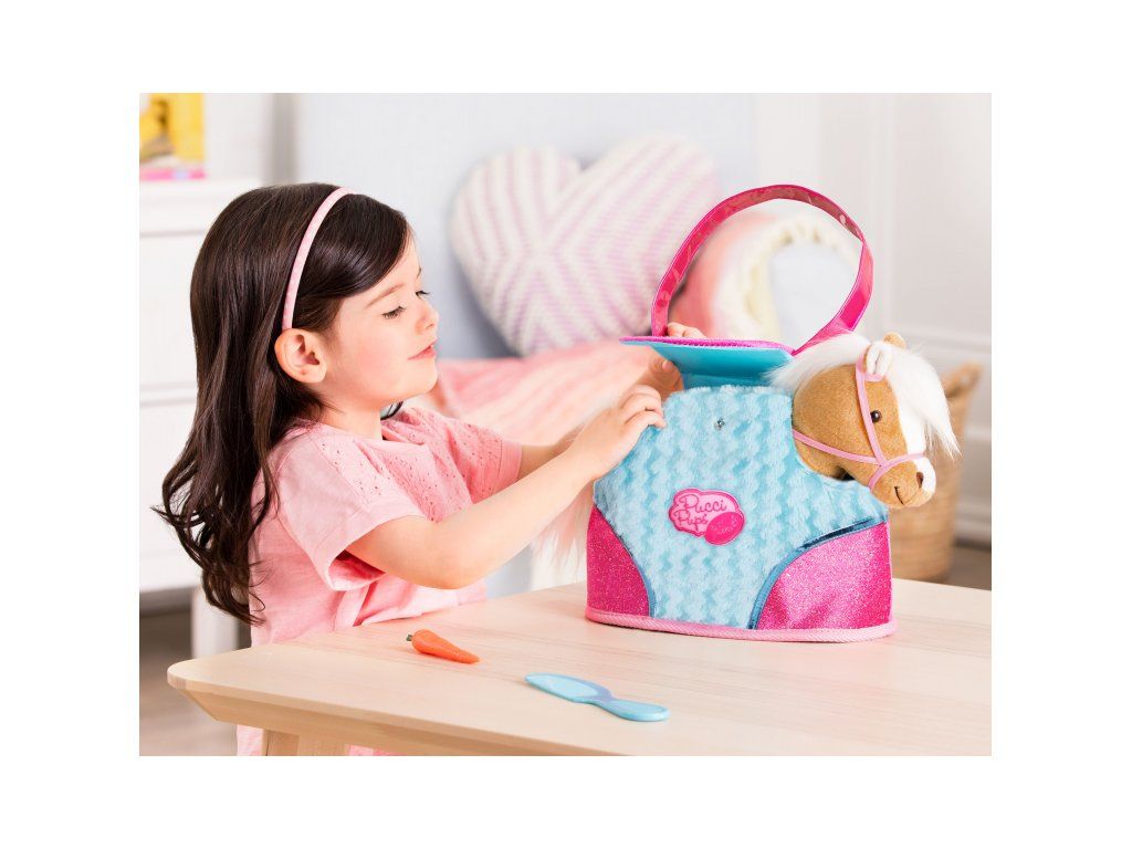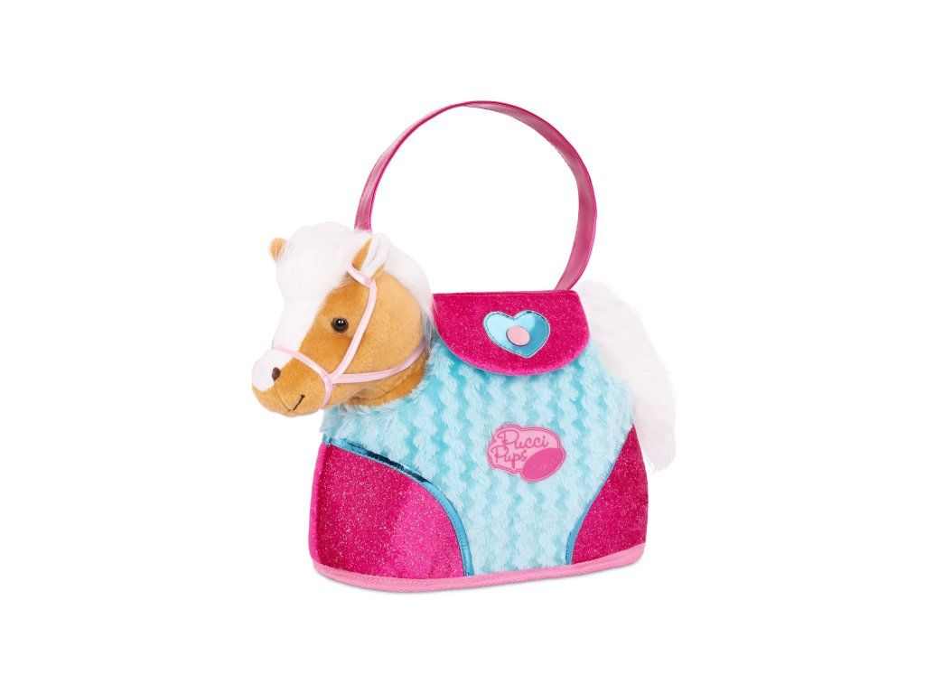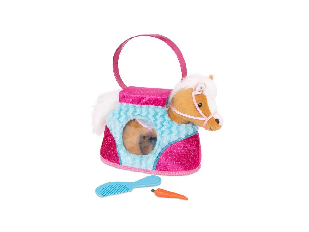 Nádherný plyšový poník v taške s krásnou potlačou je vždy pripravený na maznanie aj na prechádzku. Miluje vyčesávanie svojej hebkej hrivy hrebienkom a vďaka taške si ho vaše dieťa môže vziať kamkoľvek. Taška má postranné otvory, aby poník pri prenášaní videl na svet.