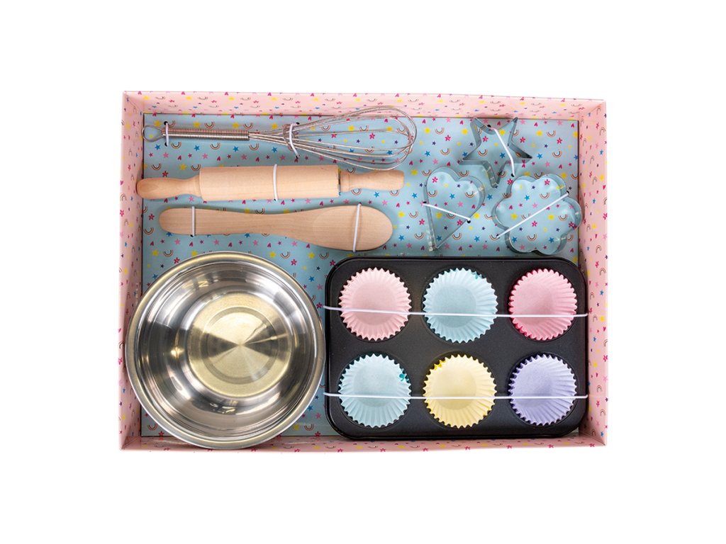 Táto veľmi roztomilá súprava na pečenie je skvelým darčekom pre začínajúcich pekárov a kreatívnych malých gurmánov. Kompletná s informačnou brožúrou s receptami, 3 formičkami na sušienky, 1 valčekom, 1 metličkou, 1 lyžičkou na miešanie, 1 miskou a 24 košíčkami na košíčky. Užite si hodiny zábavy pri šikovnosti v kuchyni s touto super cool sadou. Prečítajte si brožúru s receptami tu (dostupná v 5 rôznych jazykoch)Vhodné pre vek 3+
