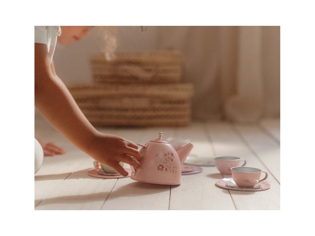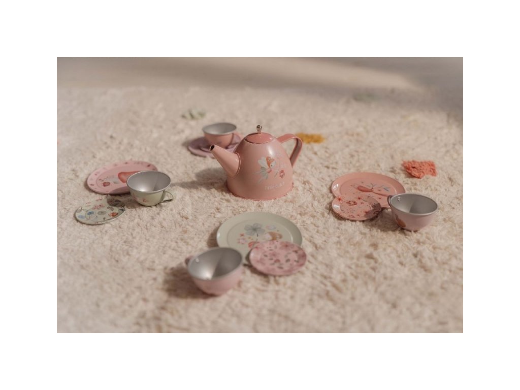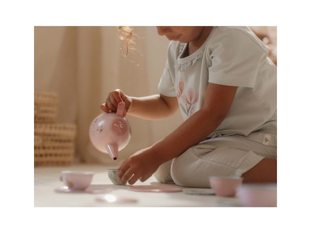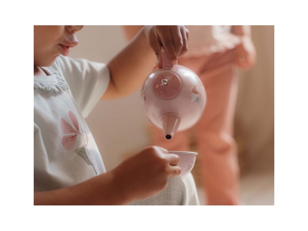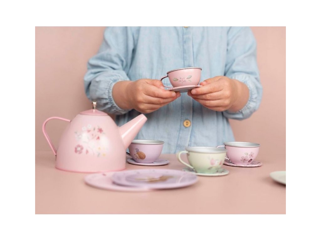 Neodolateľná sada čajovej kanvičky a štyroch hrnčekov s podšálkami v kvalitnom kovovom prevedení s krásnou potlačou motívov zo života na záhrade. Súprava poteší malú hostiteľku či hostiteľa pri organizovaní čajového večierka pre bábiky alebo pre kamarátov.