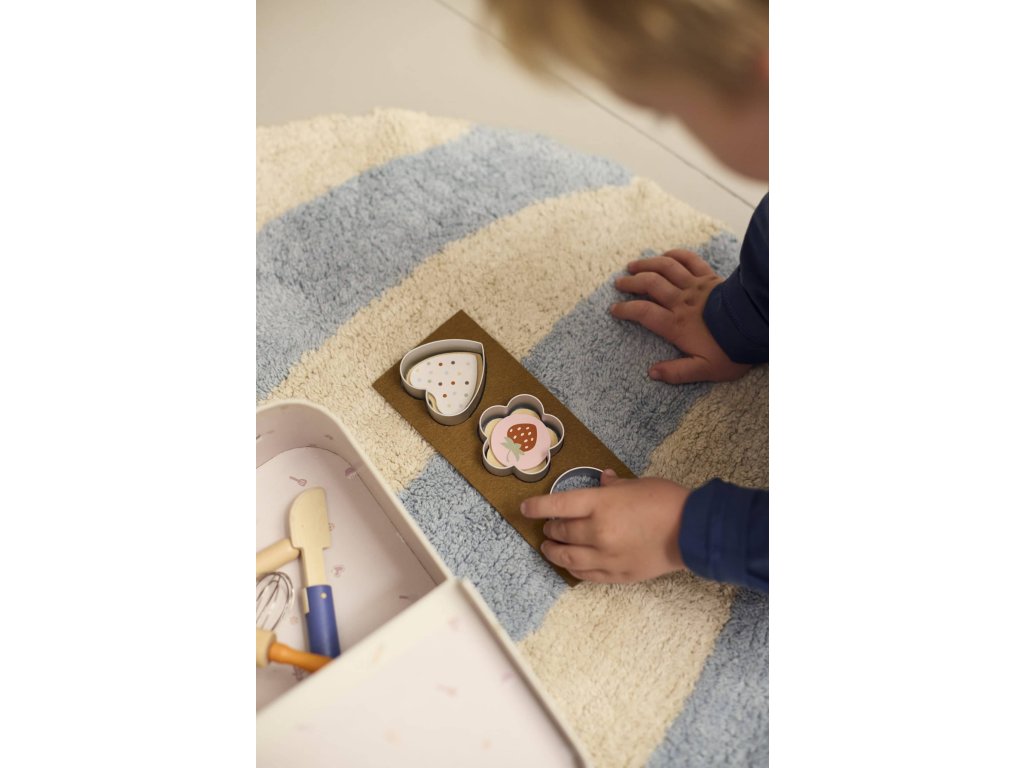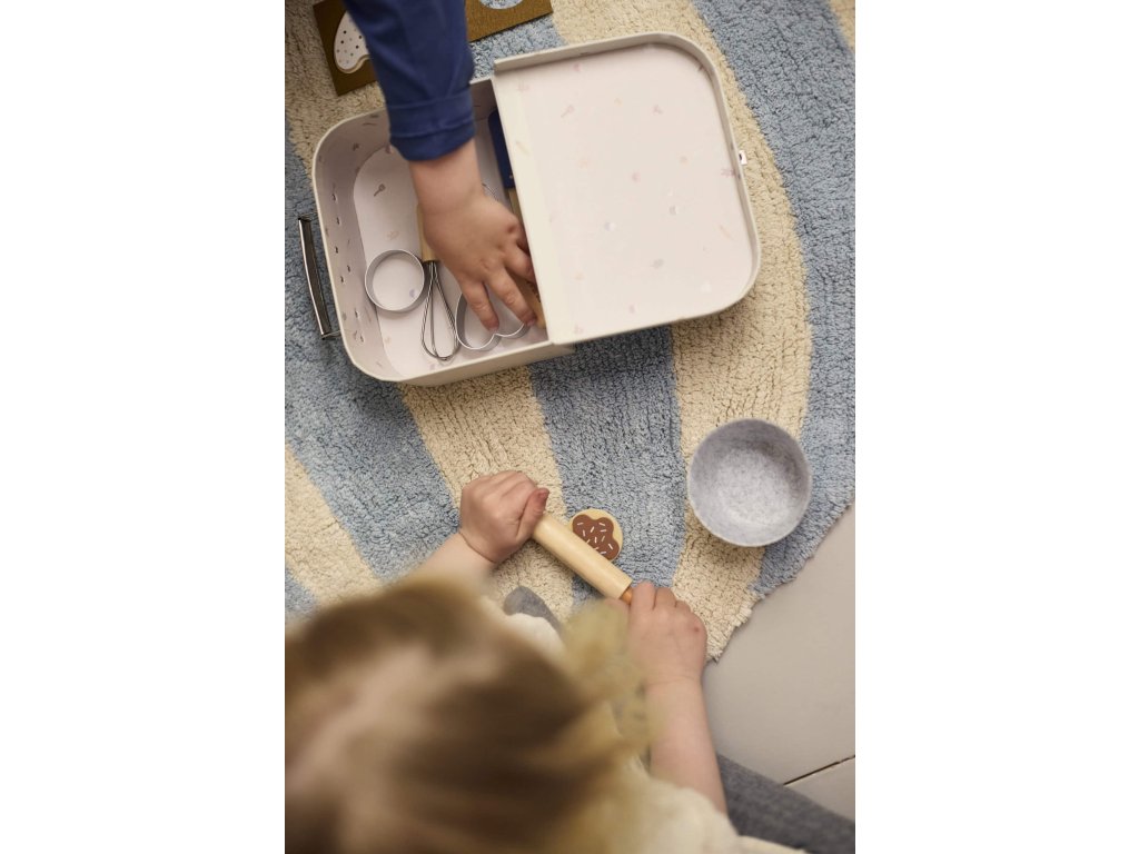 Súprava obsahuje niekoľko základných nástrojov na pečenie: vykrajovačky, sušienky, cesto, metličku, mixovaciu misu, valček a stierku. Všetko je uložené v odolnom kartónovom kufríku s kovovými rúčkami a pántmi, takže súprava je praktická aj dekoratívna. Je ideálna na udržiavanie poriadku doma alebo na to, aby ste si ju zobrali so sebou na dobrodružstvá mimo domov. Súprava podporuje kreativitu, hranie rolí a rozvoj jemnej motoriky.