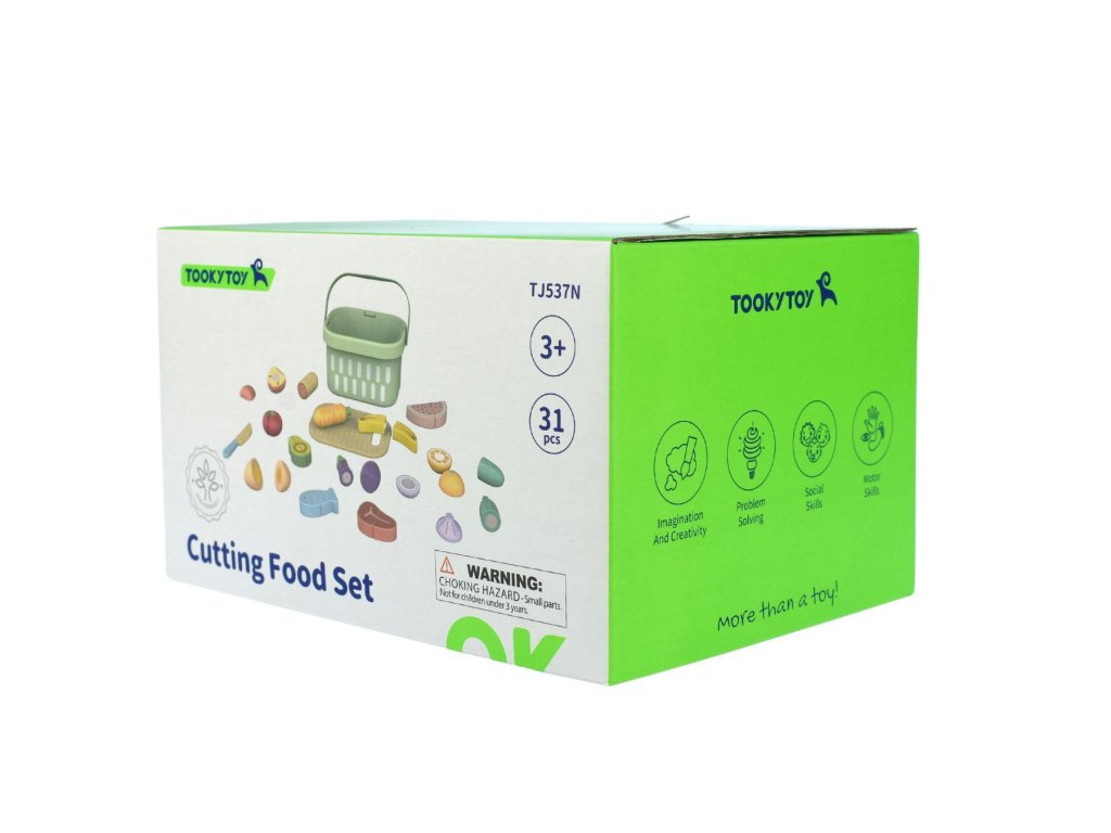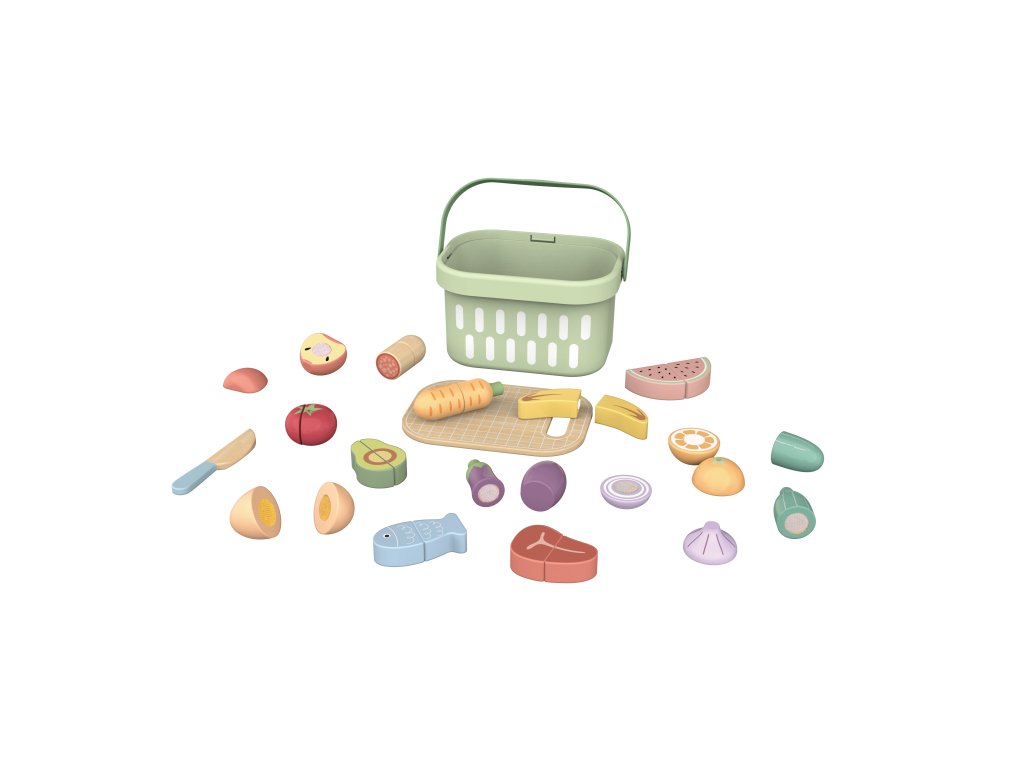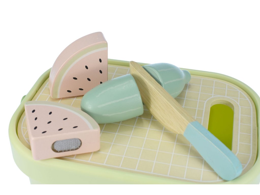 Krájanie potravín v kyblíku PastelSpustu zábavy v jednom boxeDrevené potraviny na krájanie vo vedierku od Tooky Toy sú skvelým doplnkom detskej kuchynky ale poslúžia aj na samostatné hranie. Všetkých 14 potravín sa dá ľahko prekrojiť dreveným nožíkom vďaka suchému zipsu. Veko vedierka slúži ako doska na krájanie. Po hre zase všetko deti uložia do praktického boxu. Medzi potravinami nechýba rôznorodá zelenina či ovocie, vajíčko, rybička či steak.Deti sa naučia krájať hravou cestouKrájacie drevené potraviny deti zabavia, ale tiež ich hravou cestou učia, ako krájať skutočné potraviny a pomáhať tak v kuchyni. Zlepšujú si jemnú motoriku, rozširujú si slovnú zásobu. Celý set je vyrobený z dreva a ďalších bezpečných materiálov, použité farby sú netoxické a set je pre deti bezpečný. Skvelý darček k narodeninám!