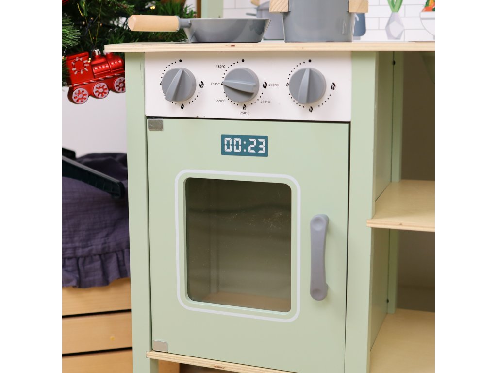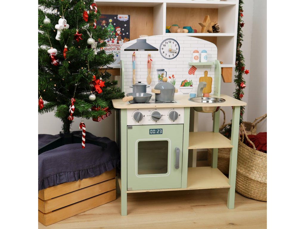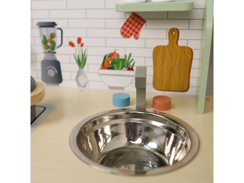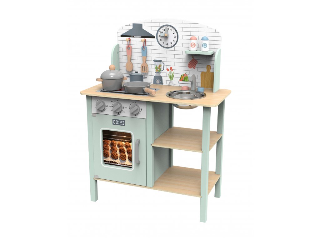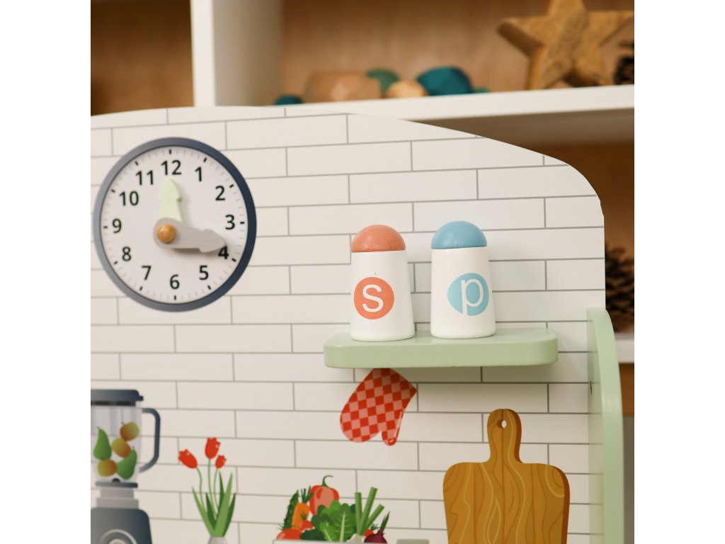 Kuchynka Pastel Dokonalá kuchynka pre malých kuchárov Neprehliadnuteľná detská kuchynka z dreva v pastelových farbách od Tooky Toy je skvelou hračkou na rolové hry na dospelých aj profesie. Drevená kuchynka sa stane jedinečným doplnkom detskej izbičky, podporí hru na kuchárov aj cukrárov. Okrem kuchynky v boxe nájdete ďalších 8 dielikov dreveného príslušenstva, ako sú hrnce a kuchynské potreby. Kuchynka má hodiny, rúru, kohútiky aj drez, aby hra deti ešte viac bavila.Deti si rozvíjajú sociálne zručnosti Detská kuchynka z dreva v pastelových farbách s príslušenstvom pomáha deťom vďaka hre na dospelých zlepšovať sa v sociálnych zručnostiach a komunikácii. Deti sú pri hre kreatívne a získavajú kladný vzťah k príprave a servírovaniu jedla. Drevené hračky pre deti Tooky Toy sú vyrobené z pevného, dobre opracovaného dreva z udržateľných zdrojov a sú natreté netoxickými farbami a lakom. Sada je skvelým narodeninovým darčekom pre deti.Dodatočné parametre