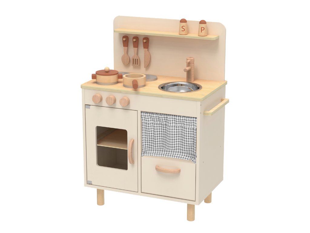 Kuchynka s vybavením Nature Dokonalá kuchynka pre malých kuchárov Neprehliadnuteľná detská kuchynka so vzhľadom prírodného dreva od Tooky Toy je skvelou hračkou pre rolové hry na dospelých aj profesie. Drevená kuchynka sa stane jedinečným doplnkom detskej izbičky, podporí hru na kuchárov aj cukrárov. Okrem kuchynky v krabici nájdete ďalších 8 kúskov dreveného príslušenstva, ako sú hrnce a ďalšie kuchynské potreby. Kuchynka má rôzne poličky, variče, kohútiky aj kovový drez, do ktorého ide dať voda, aby hra deti ešte viac bavila.Deti si rozvíjajú sociálne zručnosti Detská kuchynka z dreva v prírodných farbách s príslušenstvom pomáha deťom vďaka hre na dospelých zlepšovať sa v sociálnych zručnostiach a komunikácii. Deti sú pri hre kreatívne a získavajú kladný vzťah k príprave a servírovaniu jedla. Drevené hračky pre deti Tooky Toy sú vyrobené z pevného, dobre opracovaného dreva z udržateľných zdrojov a sú natreté netoxickými farbami a lakom. Sada je skvelým narodeninovým darčekom pre deti.Dodatočné parametre