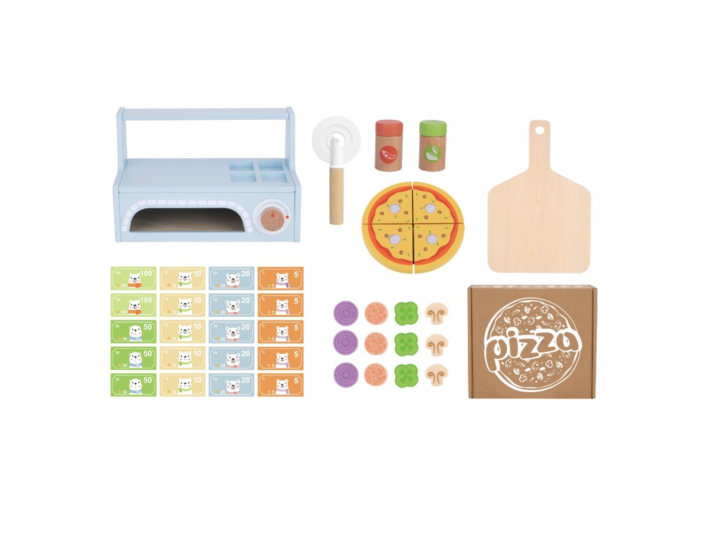 Pizza set na pečenie Drevený set na pečenie pizze Ak máte doma malých gurmánov, ktorí radi varia, určite im urobí radosť Pizza set na pečenie. S týmto setom si deti môžu vytvoriť vlastnú pizzu podľa svojej chuti, upiecť ju v peci a nakrájať na kúsky. Kvalitná hračka s príslušenstvom Pizza set obsahuje všetko, čo dieťa potrebuje na prevádzkovanie vlastnej pizzerie: pec, pizzové cesto, prísady, soľ, korenie, dosku do pece, krabicu na pizzu... Všetko je vyrobené z kvalitného dreva a netoxických farieb.Dodatočné parametre