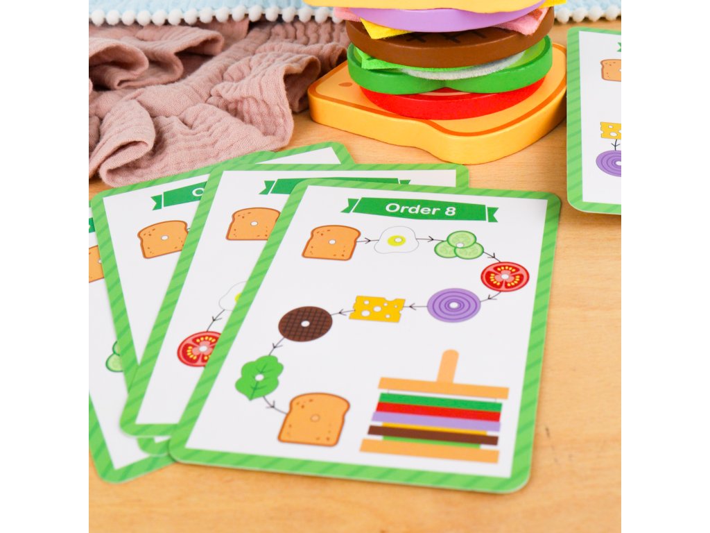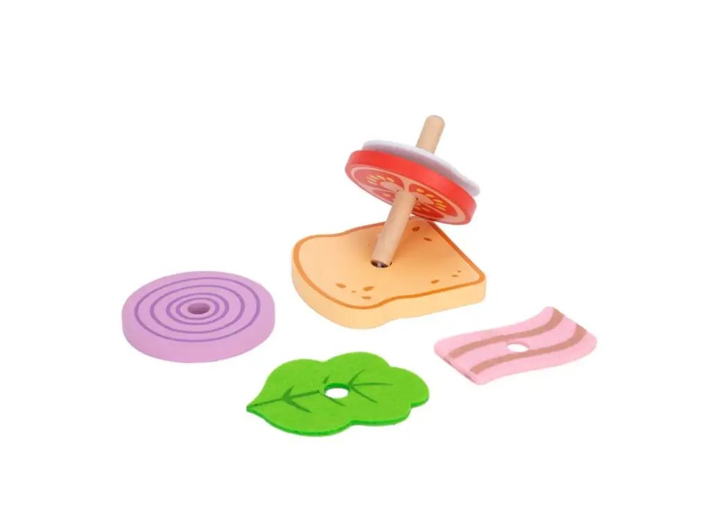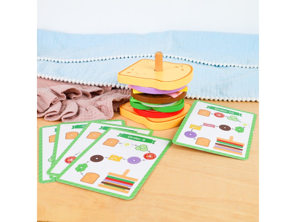 Poskladaj si sendvičUž sa vám zbiehajú slinky na poriadny sendvič?Táto drevená hračka od značky Tooky Toy dáva deťom možnosť postaviť si sendvič krok za krokom: od krajca chleba až po volské oko, paradajku či syr. Hra rozvíja motoriku i tvorivosť — deti kombinujú vrstvy podľa predlôh alebo vlastnej fantázie.Prečo je tento sendvič skvelou voľbou do detskej kuchynky?Obsahuje 10 dielikov potravín – chlieb, slanina, vajíčko, uhorka, syr a ďalšie – pre mnoho kombinácií. Hra podporuje rozpoznávanie farieb, tvarov a potravín, pričom sa deti učia základné koncepty hravou formou. Rozvíja jemnú motoriku a koordináciu ruka–oko pri vrstvení a manipulácii dielov. Vyrobené z kvalitného dreva a natreté netoxickými farbami – bezpečné pre deti. Odporúčané pre deti od 2–3 rokov, vhodné ako prvá interaktívna hračka do kuchynky či herne.Dodatočné parametre