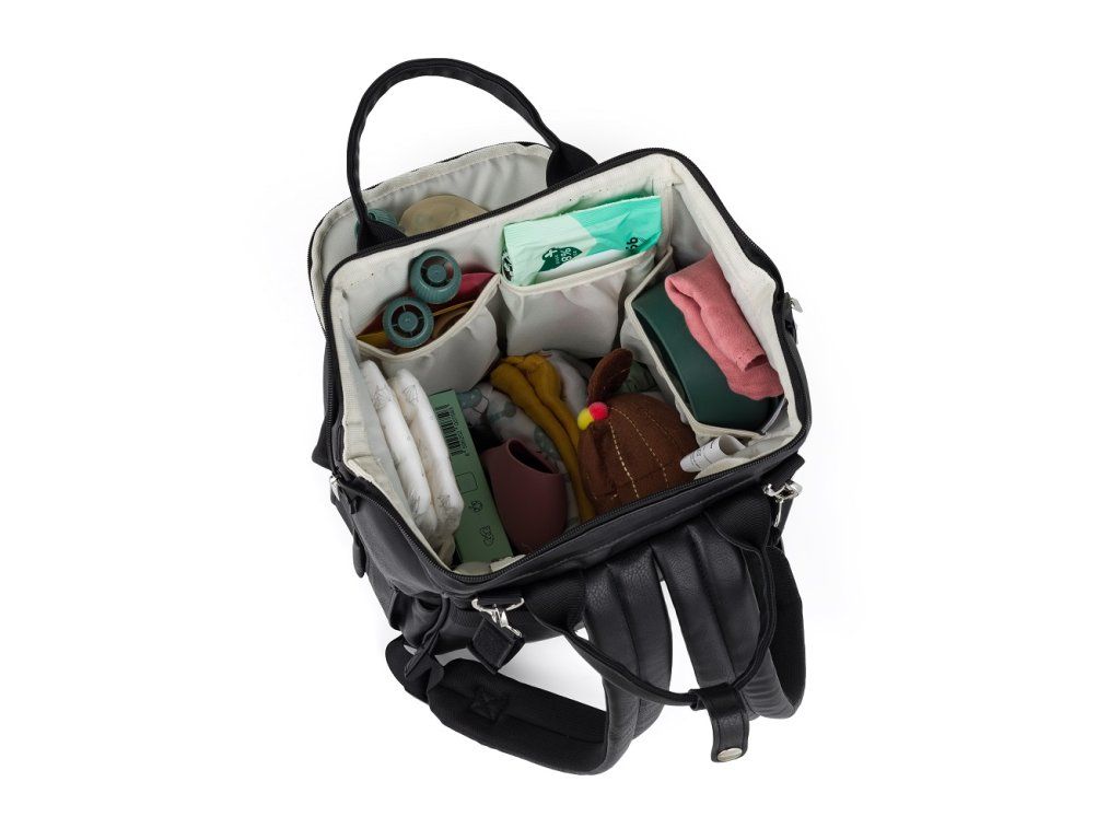 Priestranná hlavná priehradka, zapínaná na obojsmerný zips, sa doširoka otvára pre ľahký prístup ku všetkým veciam, ktoré potrebujete. Batoh má dvanásť funkčných vreciek vrátane vyhradeného vrecka na tablet alebo vlhčené obrúsky, zatepleného vrecka, vodotesného vrecka na mokré veci a priestoru na fľaše a kľúče.
