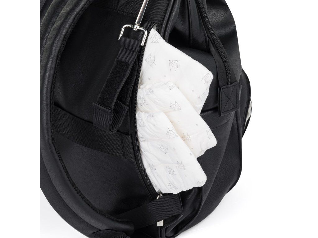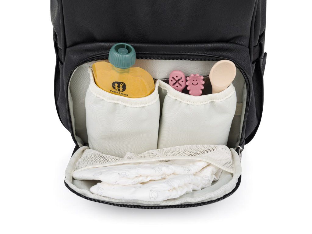 Batoh váži menej ako kilogram a je vyrobený z kvalitného vodeodolného PU materiálu pre stabilitu a dlhú životnosť. Bočné odnímateľné popruhy umožňujú batoh ľahko pripevniť na kočík akejkoľvek značky. Ramenné popruhy s extra vrstvou peny zaručujú pohodlie aj pri dlhodobom nosení a vnútorná podšívka vo svetlej farbe uľahčuje rýchle nájdenie vecí, ktoré potrebujete, a udržiavanie poriadku.