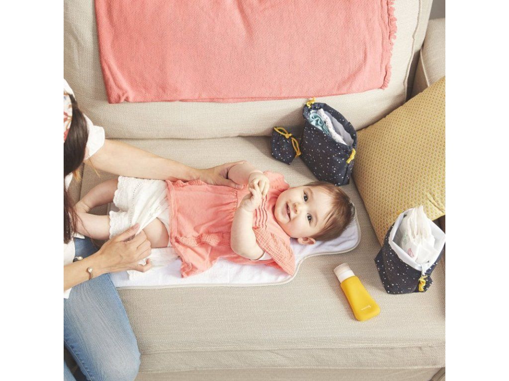 - prebaľovacia podložka (62cm x 32cm x 0,3cm) je skladateľná, možno ju prať, na jednej strane má froté materiál
