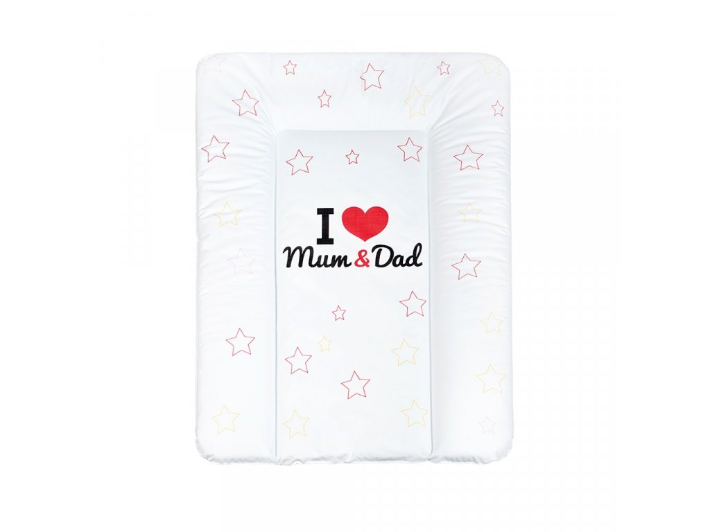 Praktická mäkká prebaľovacia podložka New Baby z nepremokavého, plastového materiálu s obrázkom farebných hviezdičiek a nápisom I love Mum and Dad. Je vyrobená z najkvalitnejšej certifikovanej fólie, ktorá neobsahuje žiadne škodlivé látky a je citlivá k najjemnejšej detskej pokožke. Rozmer: cca 70x50 cm, hrúbka cca 4 cm.Dodatočné parametre