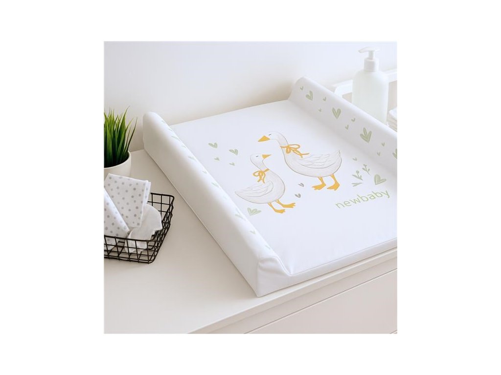 Praktická tvarovaná prebaľovacia podložka New Baby Husičky z nepremokavého, plastového materiálu v príjemných pastelových farbách.