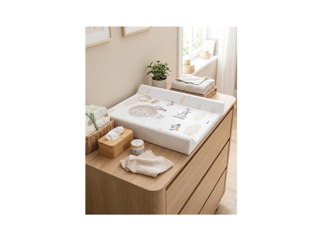 Tento konkrétny prebaľovací pult je vybavený spevnenou doskou a špeciálnymi kolíkmi, ktoré zabraňujú posúvaniu, čo ho robí stabilným a bezpečným pri používaní. Vďaka dôrazu na hygienu, bezpečnosť a pohodlie je nenahraditeľný pri každodennej starostlivosti o dieťa.