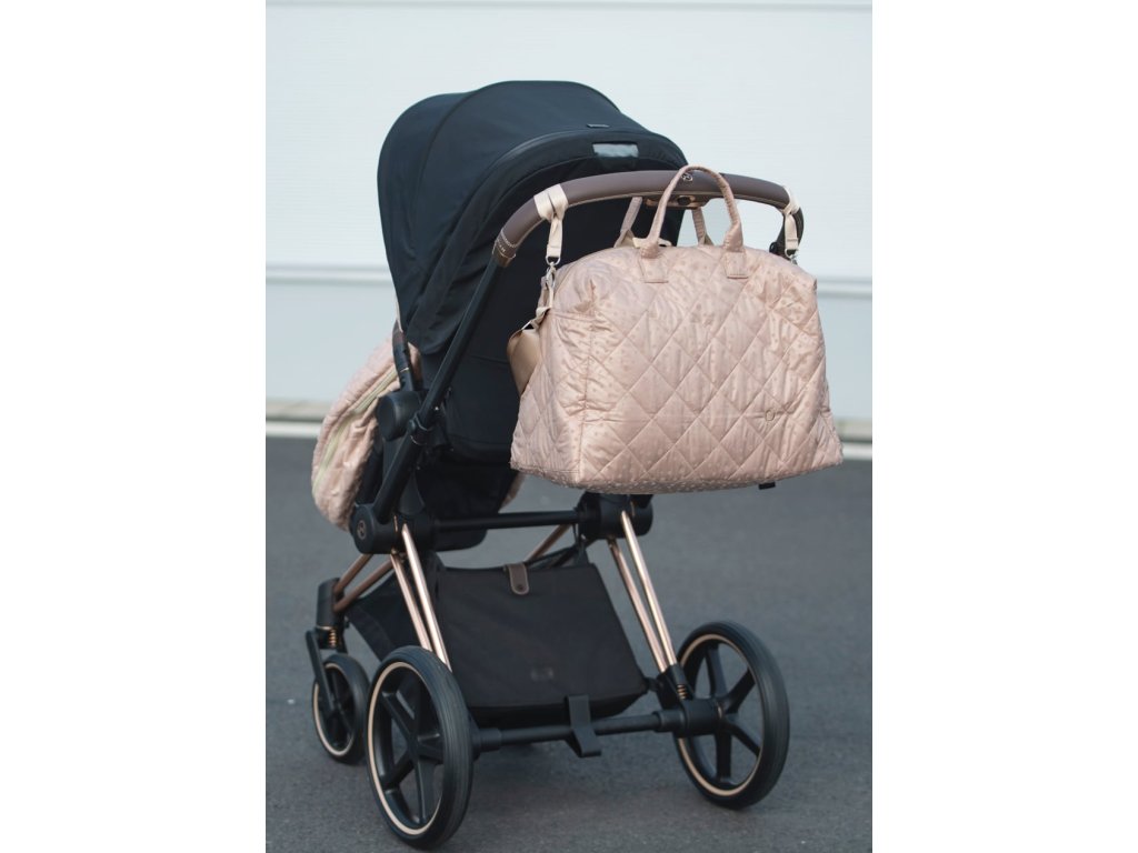 je možné pripnúť ku kočíku, na taške sú všité pútka - možné do nich ľahko pripevniť karabínky ( nie sú súčasťou tašky )