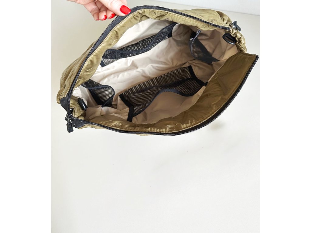 Kabelka určená na bežné nosenie ale aj na používanie na kočíku. Príjemný materiál, decentné doplnky, elegantný vzhľad.Taštička je zaujímavá aj tým, že sa dá do široko roztvoriť, čo uľahčí prehľad o vložených veciach.
