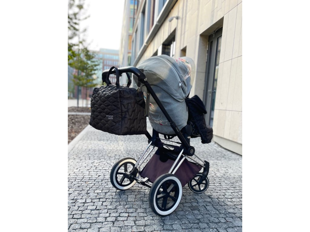 Veľmi objemná taška na kočík, ktorú môžete využívať aj na bežné nosenie.je možné pripnúť ku kočíku, na taške sú všité pútka- možné do nich ľahko pripevniť karabínky (nie sú súčasťou tašky)