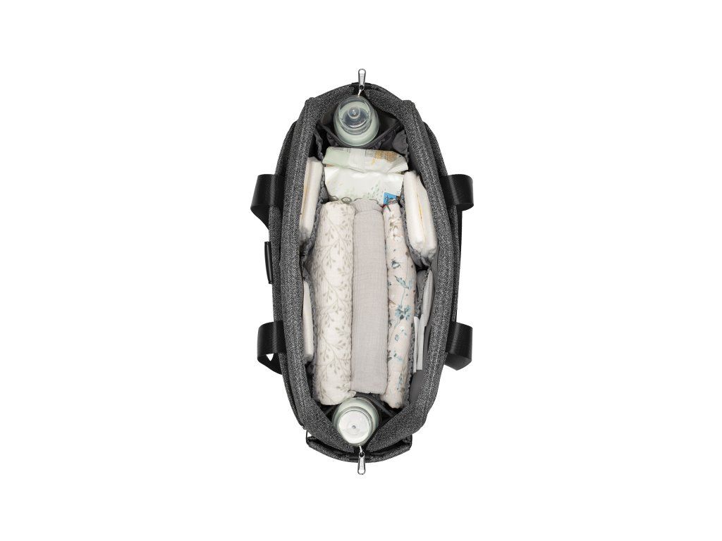 Štýlová prebaľovacia taška umožňuje prehľadné uloženie všetkého potrebného na prechádzky a výlety s vašim dieťaťom. Klipy umožňujú zavesenie na madlá kočíka.