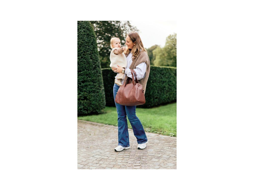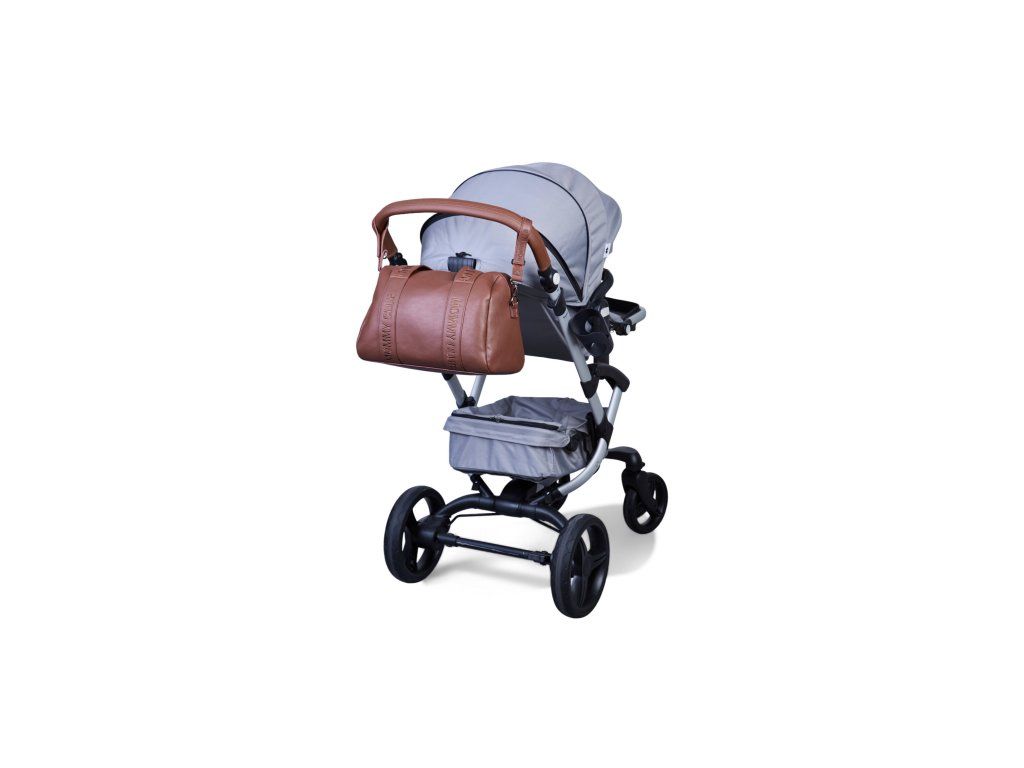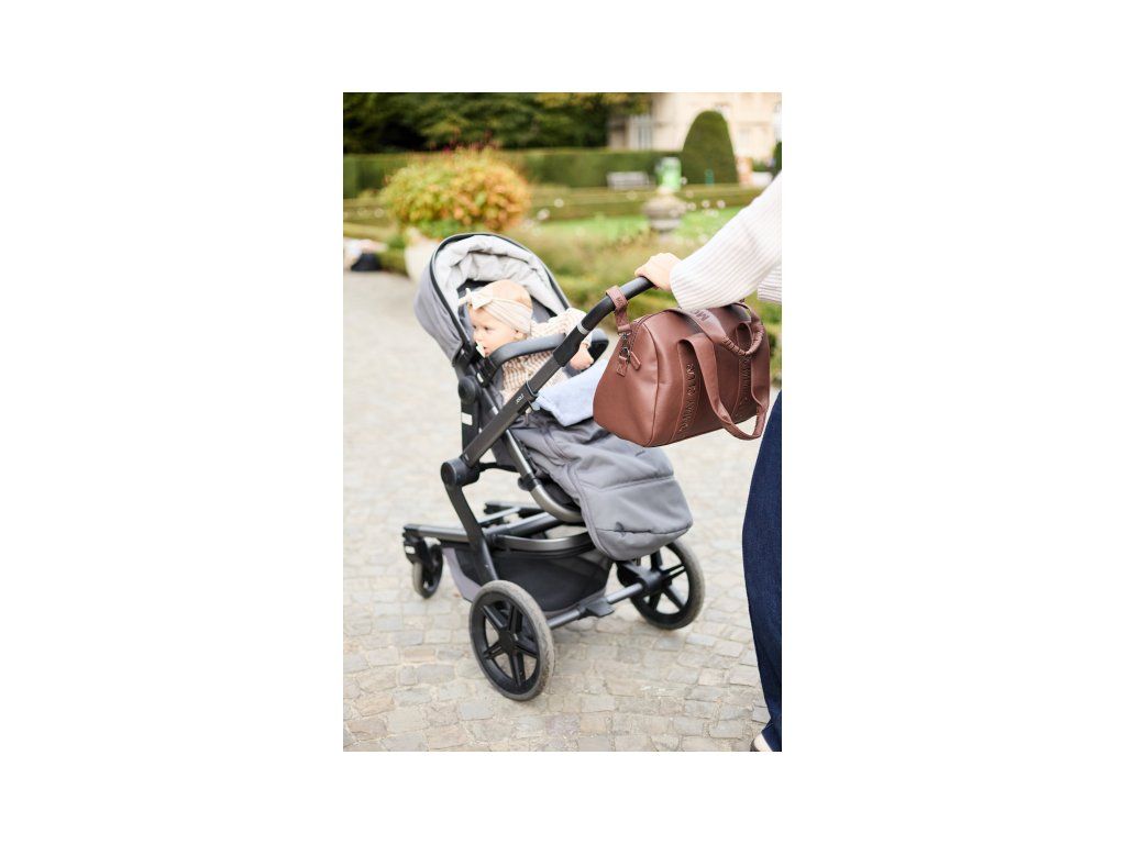 Prebaľovacia taška s uzatváraním na zips je vybavená držadlami na nosenie v ruke, popruhom na nosenie cez rameno aj úchyty na zavesenie na kočík.