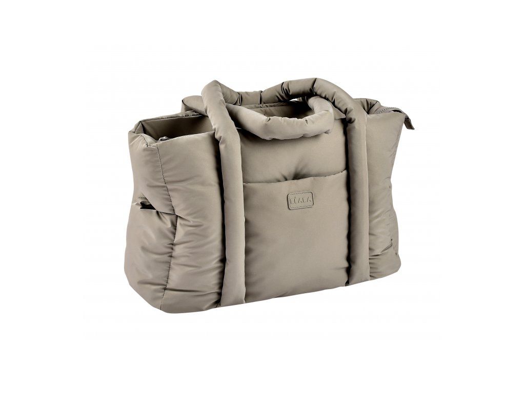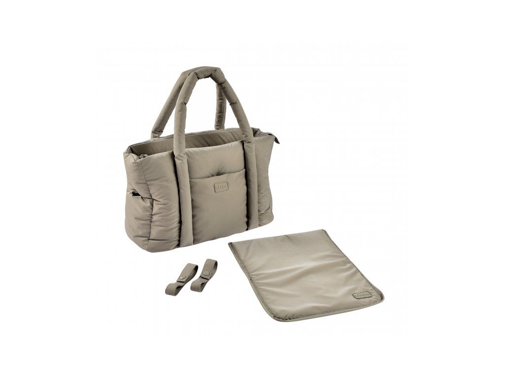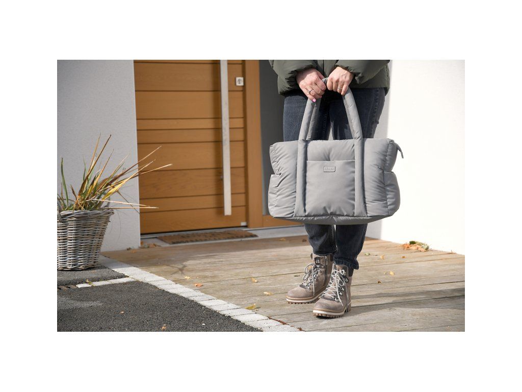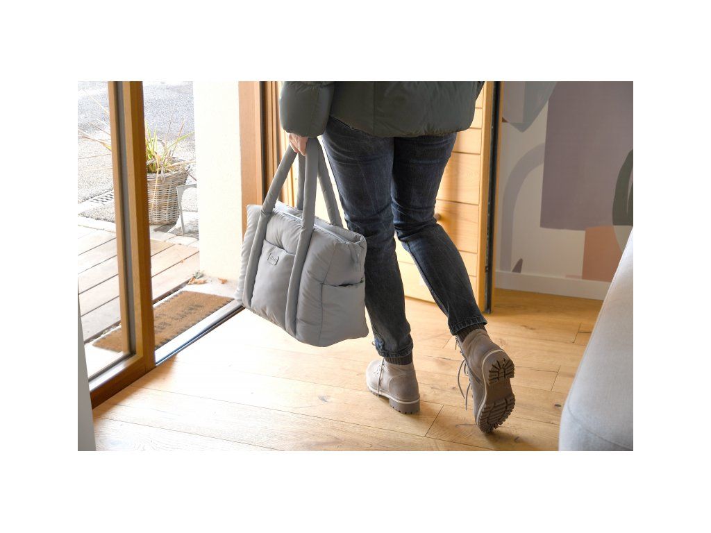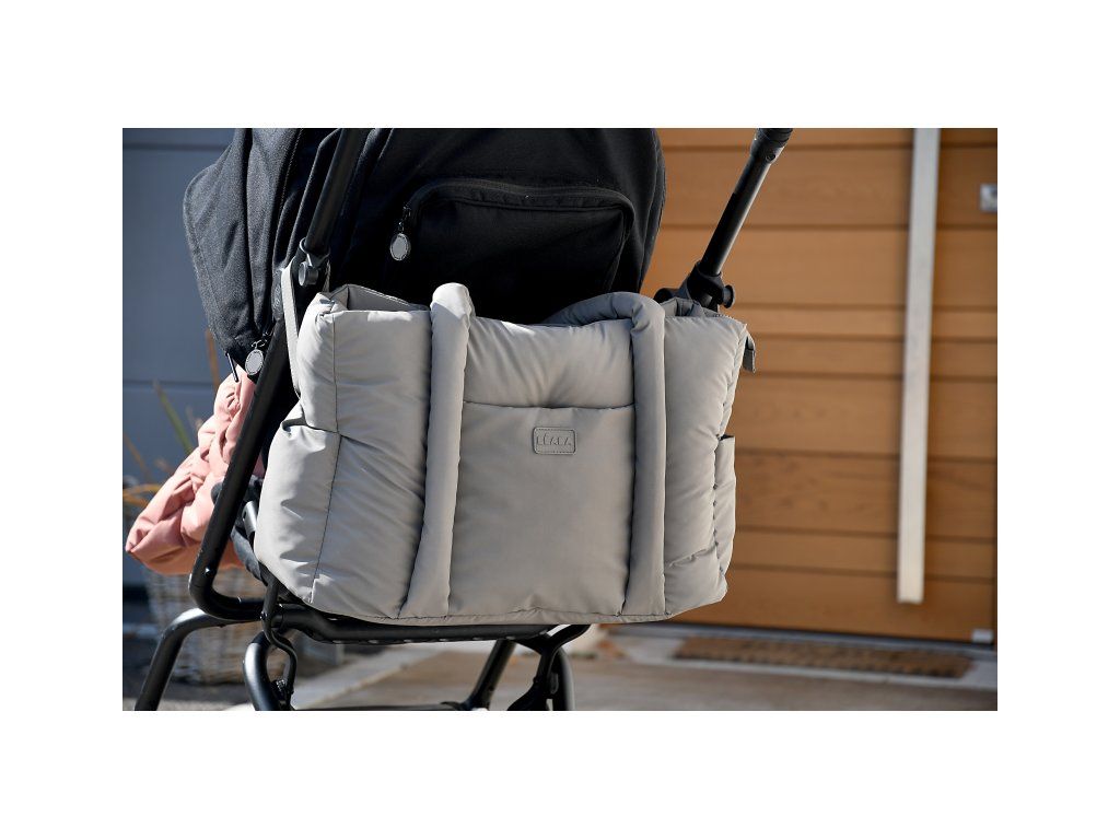 Dlhé držadlá umožňujú nosenie v ruke aj cez rameno, priložené úchyty ponúkajú možnosť zavesenia na rukoväť kočíka. Taška sa uzatvára na zips.