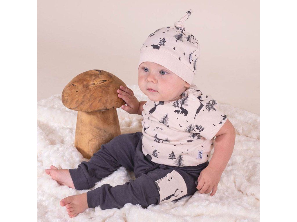 Štýlová čiapočka Nicol Bambi s roztomilým uzlíkom v hornej časti. Čiapočka je celopotlačená obrázkami s lesným motívom. Skvelá vychytávka, ktorú možno využiť ako krásny doplnok, alebo ako praktický kúsok oblečenia. Lem je široký a netlačí na hlavičku bábätka. Príjemná na dotyk a krásne sedí na hlavičke. Fantázia v obliekaní nepozná hraníc a záleží len na vás, ako čiapočku doladíte s oblečením kolekcie Bambi. Zloženie: 100% bavlna. OEKO-TEX STANDARD 100.Dodatočné parametre