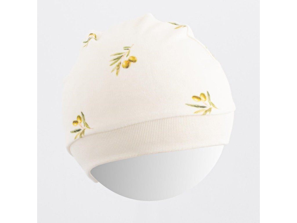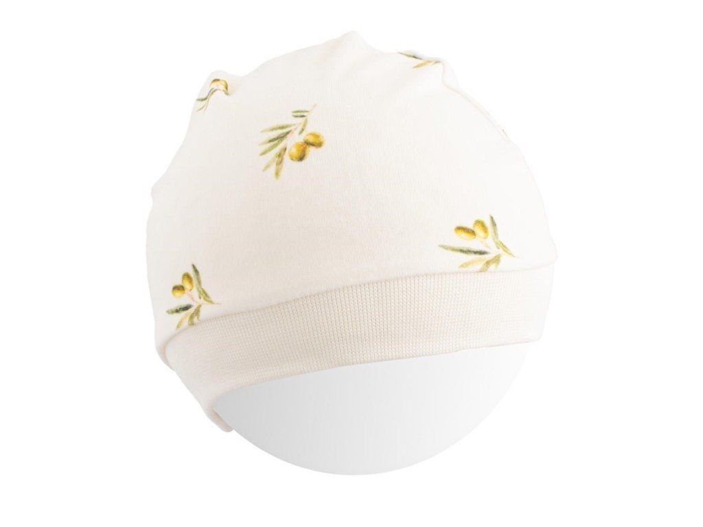 Krásna bavlnená dojčenská čiapočka New Baby Olivy. Čiapočka je vyrobená z organickej bavlny, ktorá je veľmi kvalitná, príjemná a mäkká. Je zdobená potlačou s olivkami a má širší lem, ktorý netlačí na hlavičku bábätka