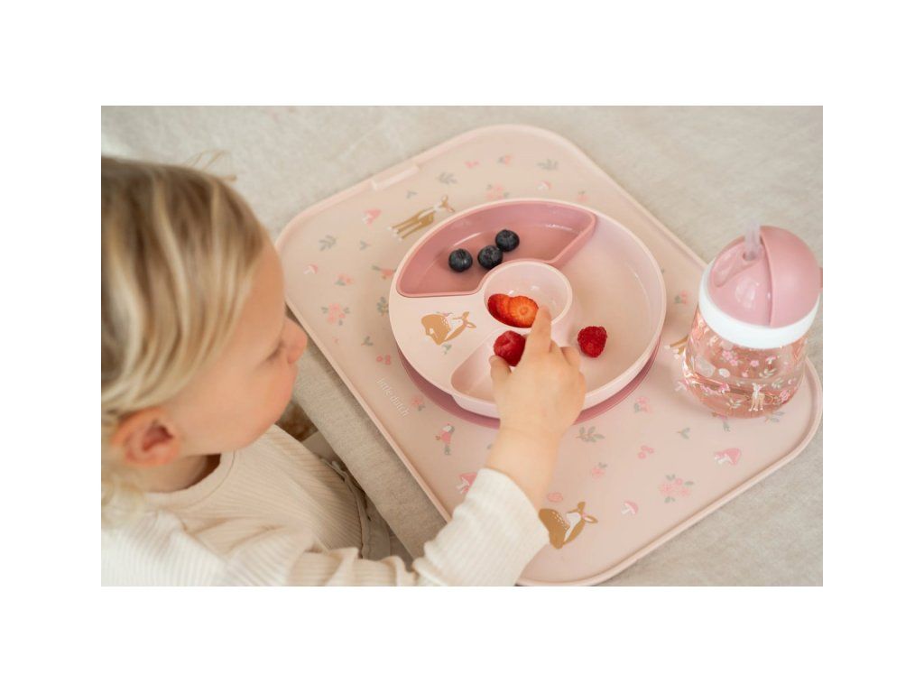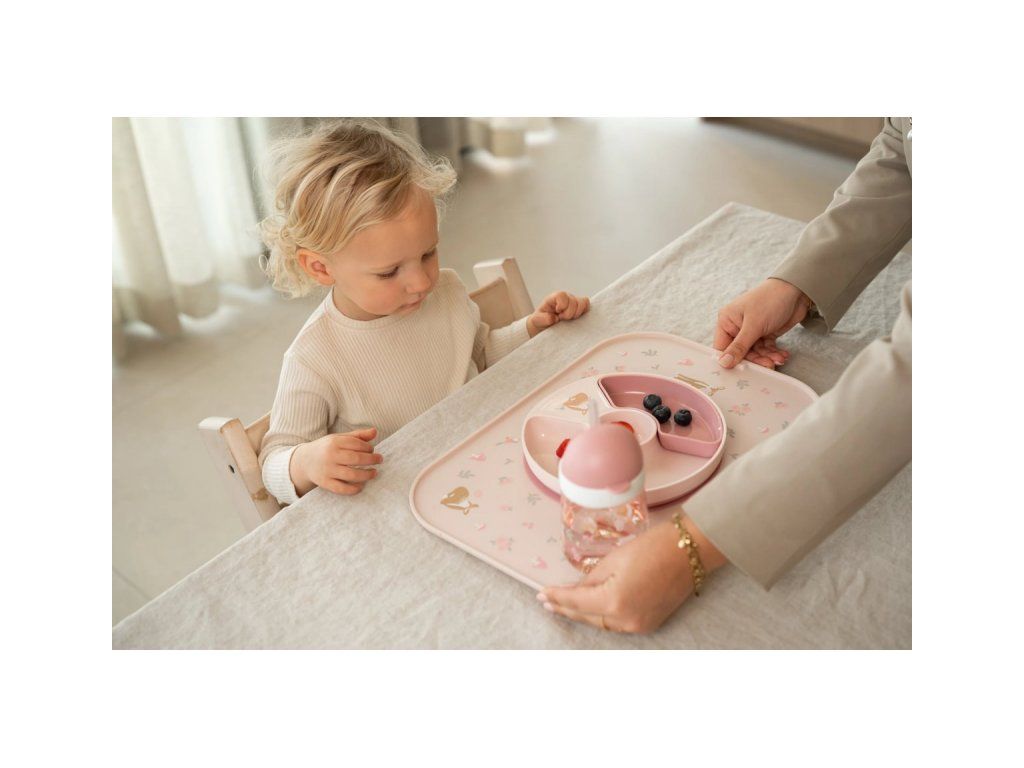 Jedálenský podnos s krásnou potlačou je ideálny pre samostatné stolovanie dieťaťa, vďaka odnímateľnej protišmykovej podložke pomáha udržať tanier či misku na mieste. Je vyrobený z mimoriadne odolného plastu.