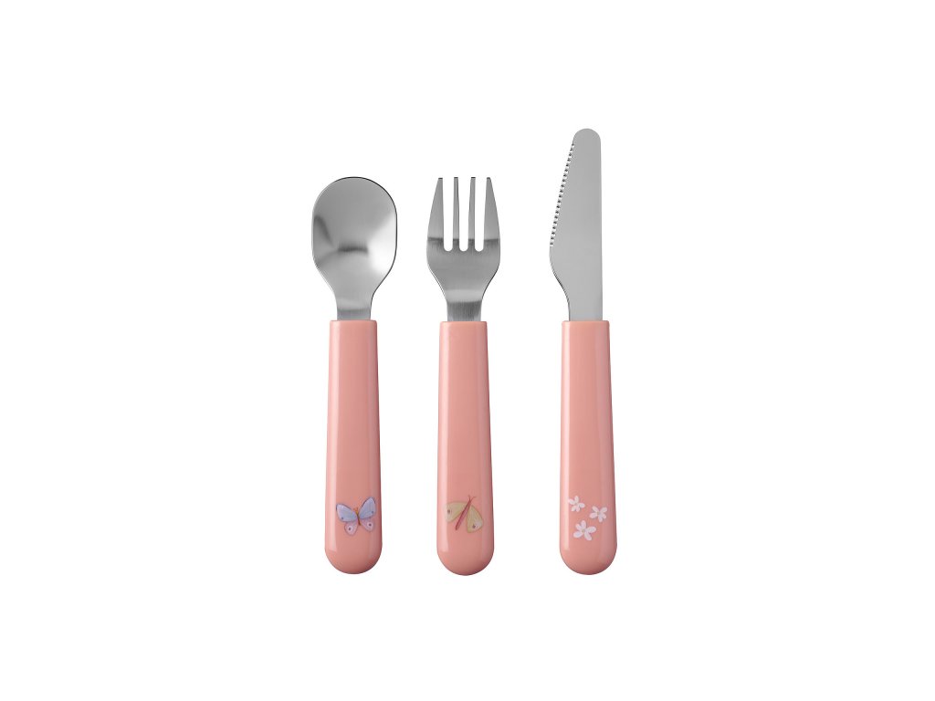 3-dielna sada príboru z kvalitnej nerezovej ocele s plastovou rukoväťou pre ľahké držanie s krásnou potlačou. Nôž má bezpečný zúbkovaný okraj.