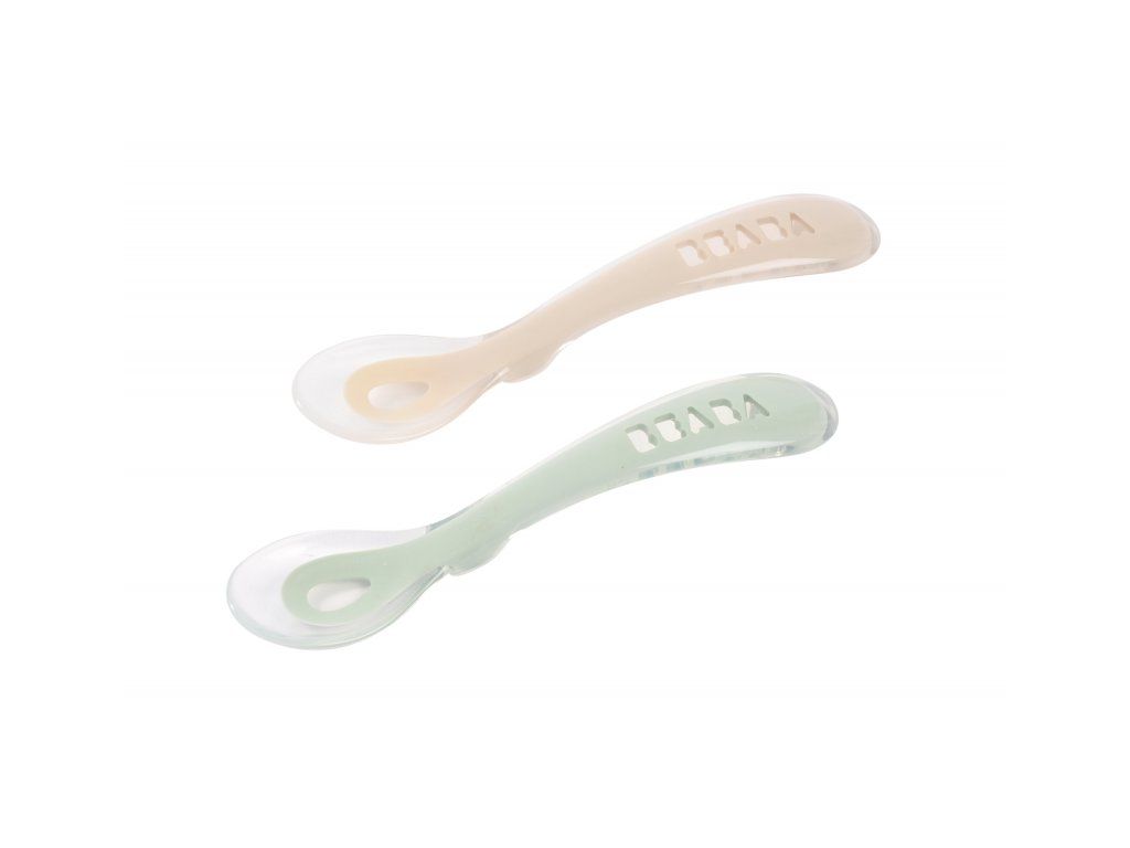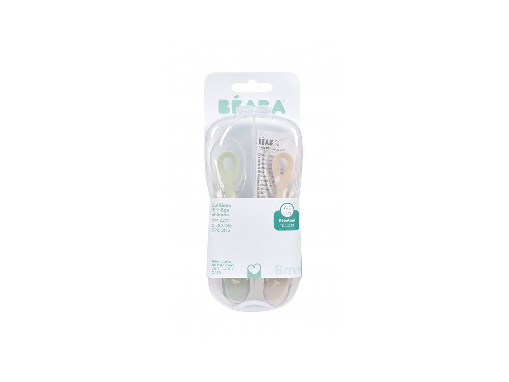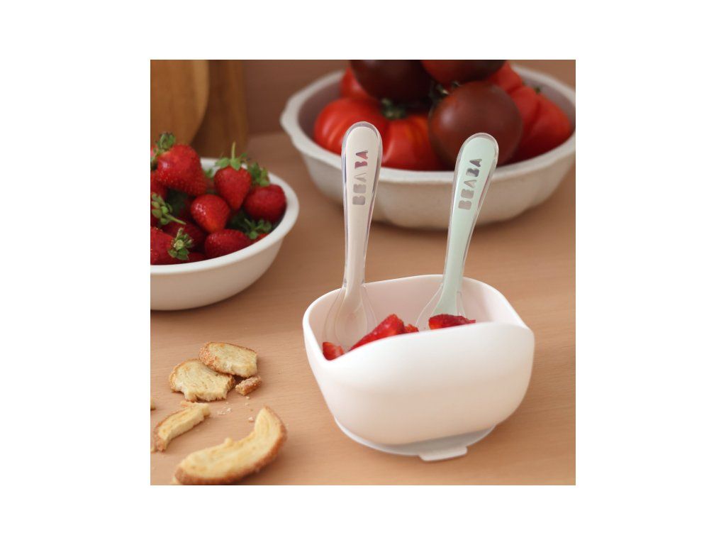 Silikónová lyžička pre prvé samostatné kŕmenie má ideálny tvar pre detské ústa. Tvar držadla uľahčuje dieťaťu držanie lyžičky. Integrovaná opierka lyžičky zabraňuje pri položení lyžičky na stôl kontaktu jedla so stolom a zaisťuje tak čistotu a hygienu. Praktické puzdro umožňuje hygienické prenášanie lyžičiek napr. v prebaľovacej taške.
