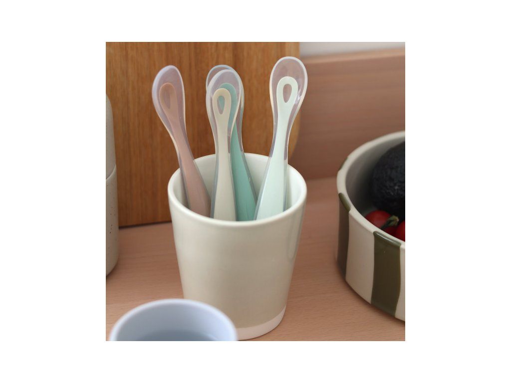 Silikónové lyžičky pre najmenších sú šetrné k citlivým detským ďasnám a navrhnuté pre hladký prechod z cumlíka na lyžičku. Dlhá rukoväť uľahčuje rodičovi naberanie z misky aj pohára bez zašpinenia rúk.