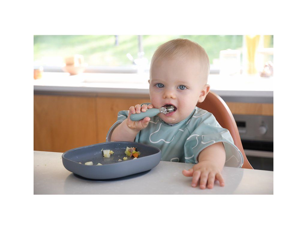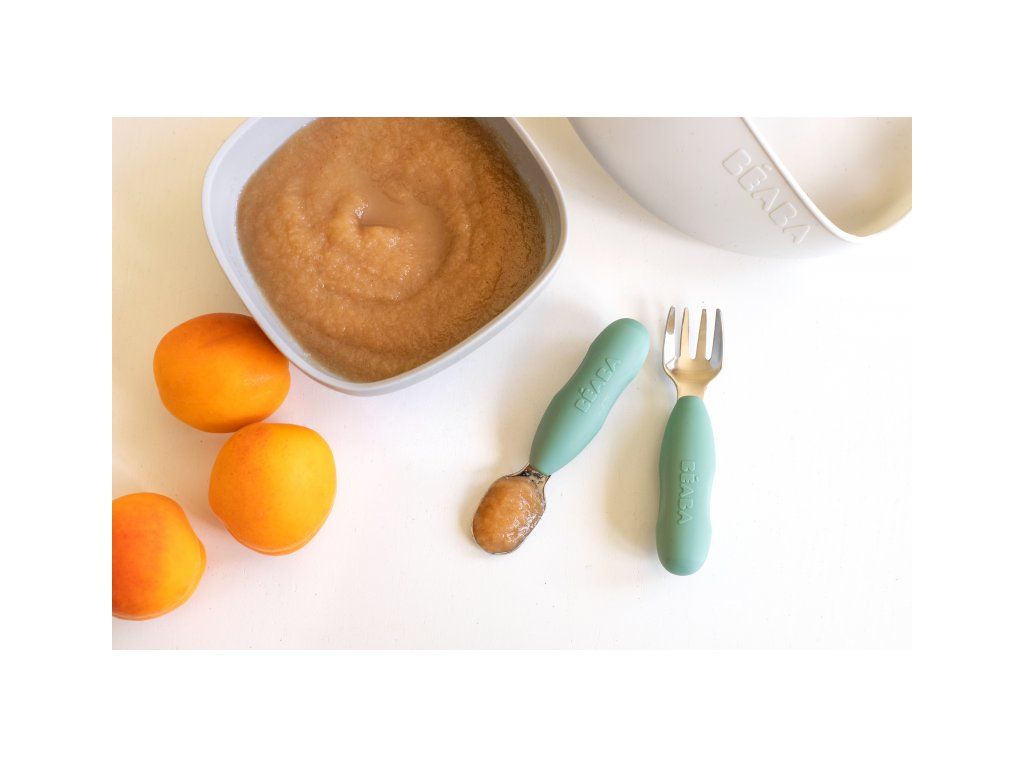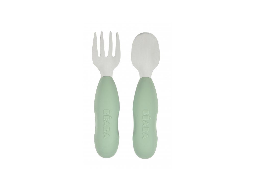 Prvý príbor z kvalitnej nerezovej ocele s plastovou rukoväťou uľahčí dieťaťu prechod od kŕmenia lyžičkou na používanie príboru. Nerezová vidlička a lyžička sú ľahké a vďaka ergonomickému plastovému držadlu ľahko uchopiteľné detskými rukami. Plytká lyžička je ideálna pre nabratie malého množstva príkrmu, ktoré dieťa dokáže doniesť až do úst. Zaguľatené hroty vidličky sú zárukou bezpečného používania.
