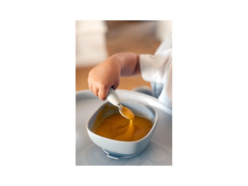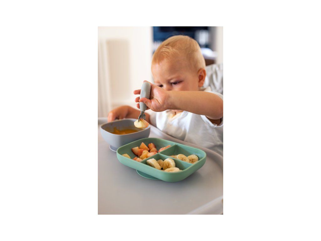 Prvý príbor z kvalitnej nerezovej ocele s plastovou rukoväťou uľahčí dieťaťu prechod od kŕmenia lyžičkou na používanie príboru. Nerezová vidlička a lyžička sú ľahké a vďaka ergonomickému plastovému držadlu ľahko uchopiteľné detskými rukami. Plytká lyžička je ideálna pre nabratie malého množstva príkrmu, ktoré dieťa dokáže doniesť až do úst. Zaguľatené hroty vidličky sú zárukou bezpečného používania.