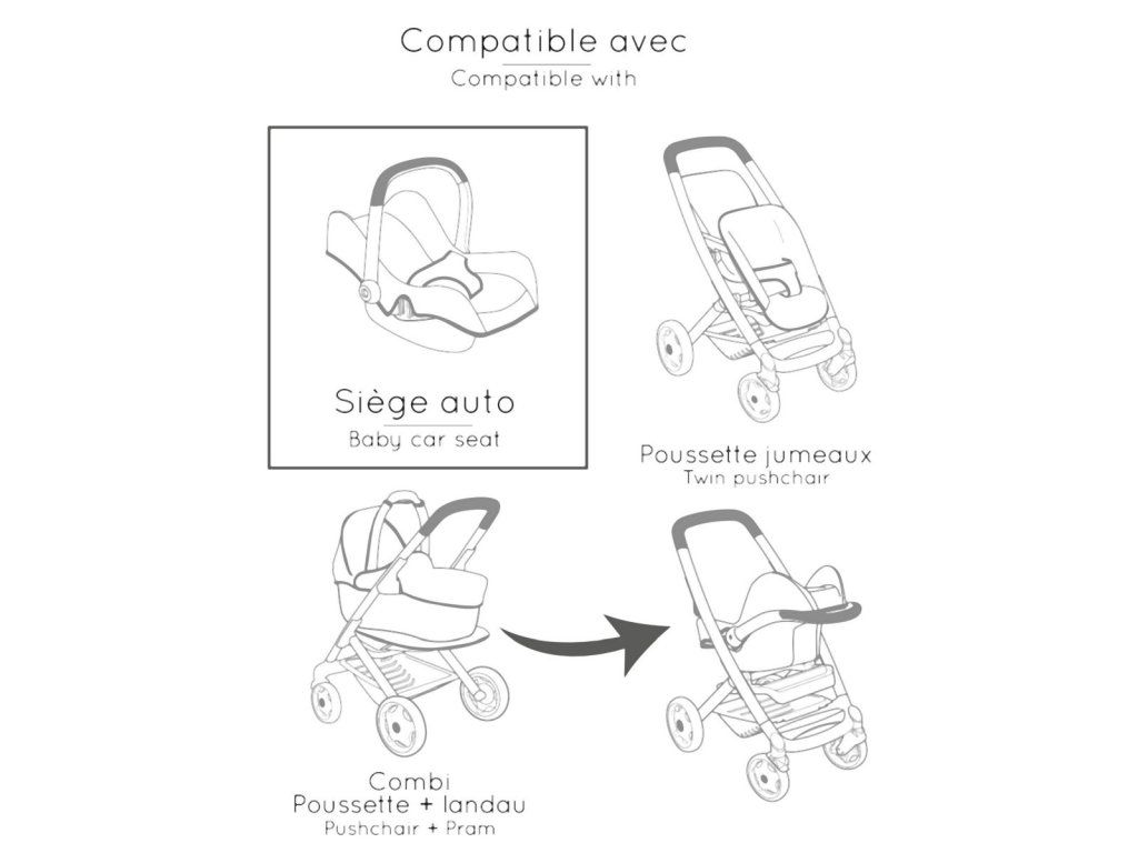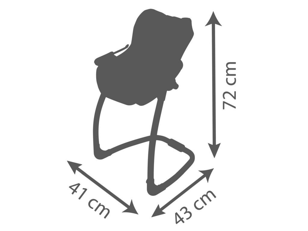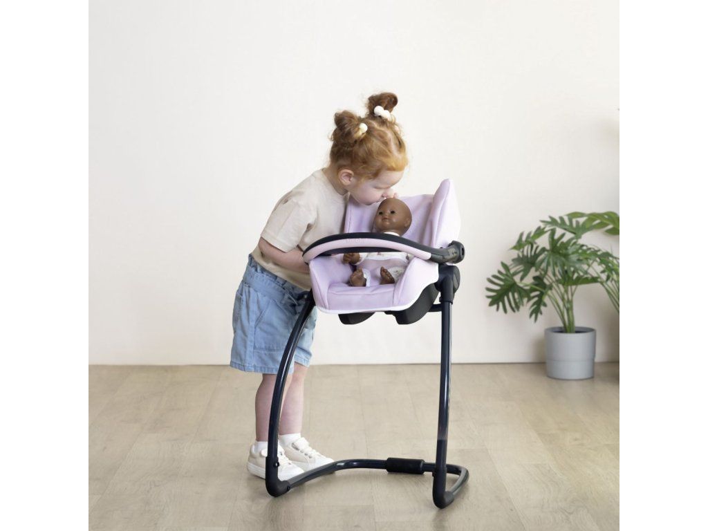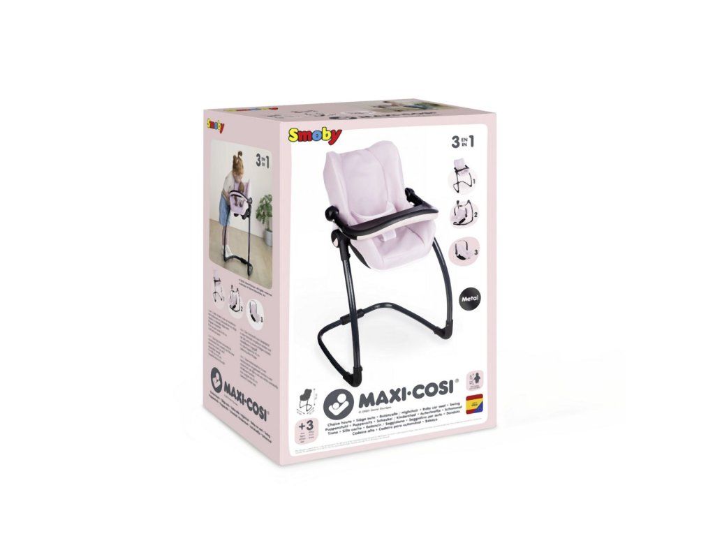 Autosedačka Maxi-Cosi 3 v 1 pre bábiky. Pri zavesení sedačky na konštrukciu je razom hojdačka pre bábiku do veľkosti 42 cm. Otočením konštrukcie získate vysokú jedálenskú stoličku s pultíkom. Rozmery (DxŠxV): 43 x 41 x 72 cm.Dodatočné parametre
