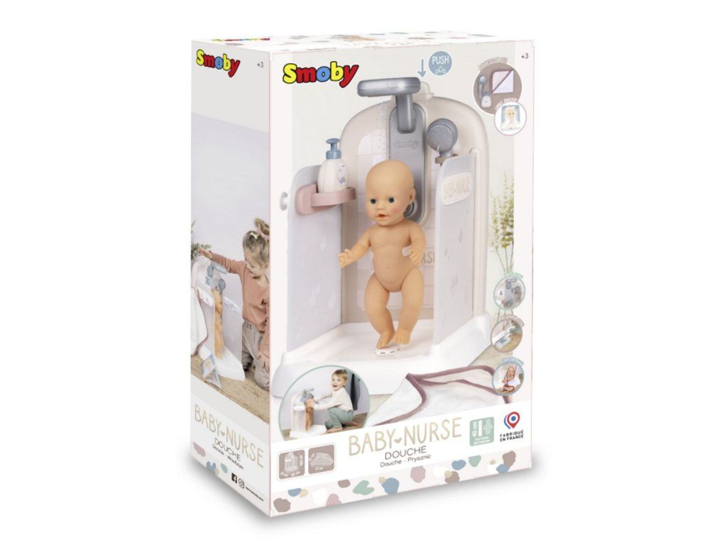 Sprchovací kút pre bábiky Baby Nurse s funkčnou sprchovou hlavicou, funkcia prúdu vody vďaka čerpadlu a nádrži na vodu. Sprcha má držiak na uterák, háčiky na župany, poličku, pevnú sprchu, hlavicu a množstvo ďalšieho príslušenstva. Vhodné pre bábiky do 40 cm (bábika nie je súčasťou balenia). Rozmery produktu (DxŠxV): 30,9 x 29,9 x 46,6 cm. Hmotnosť 1,845 kg.Dodatočné parametre