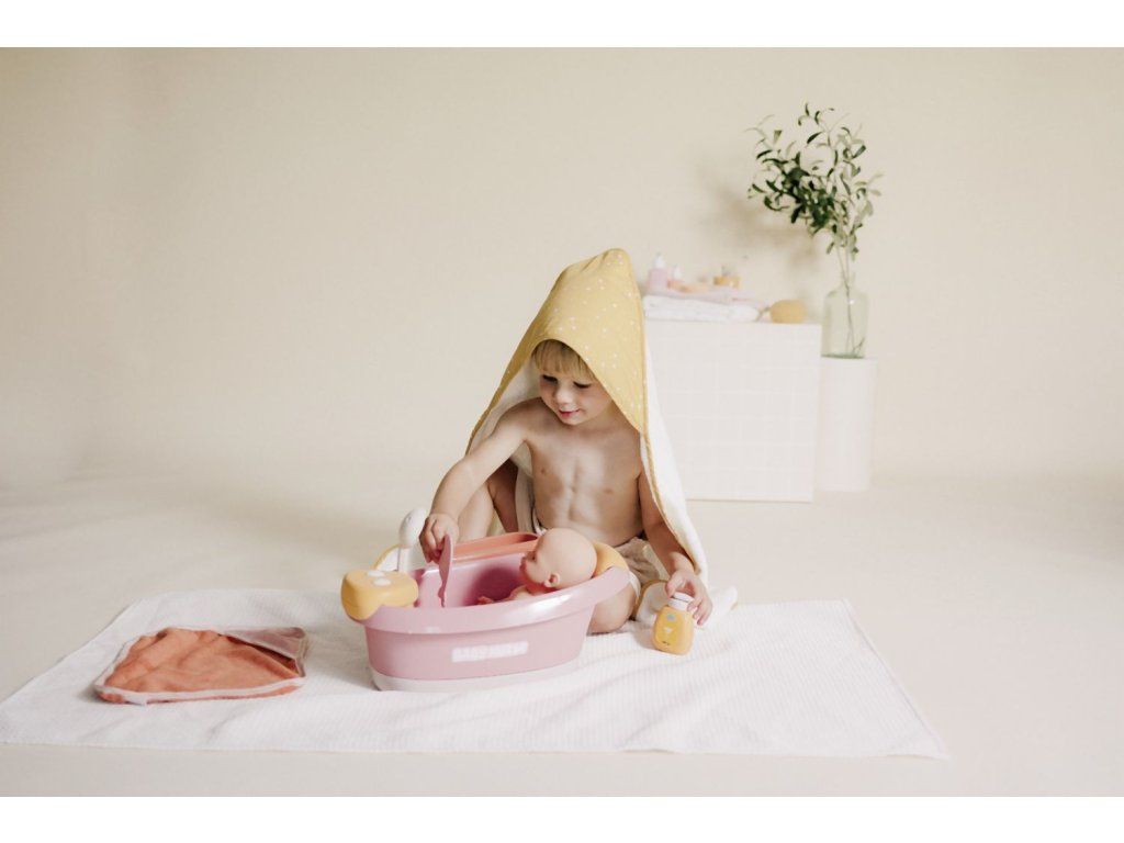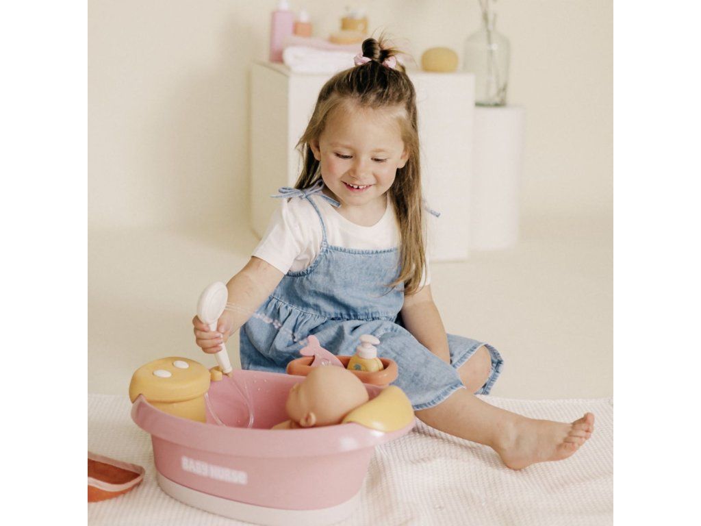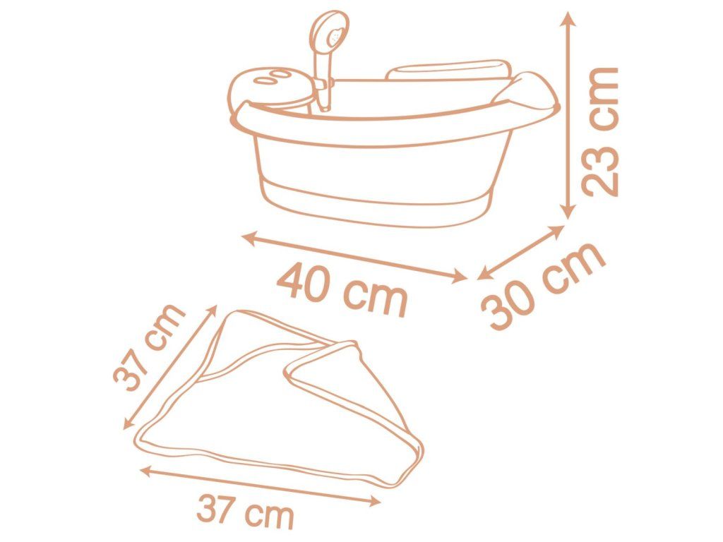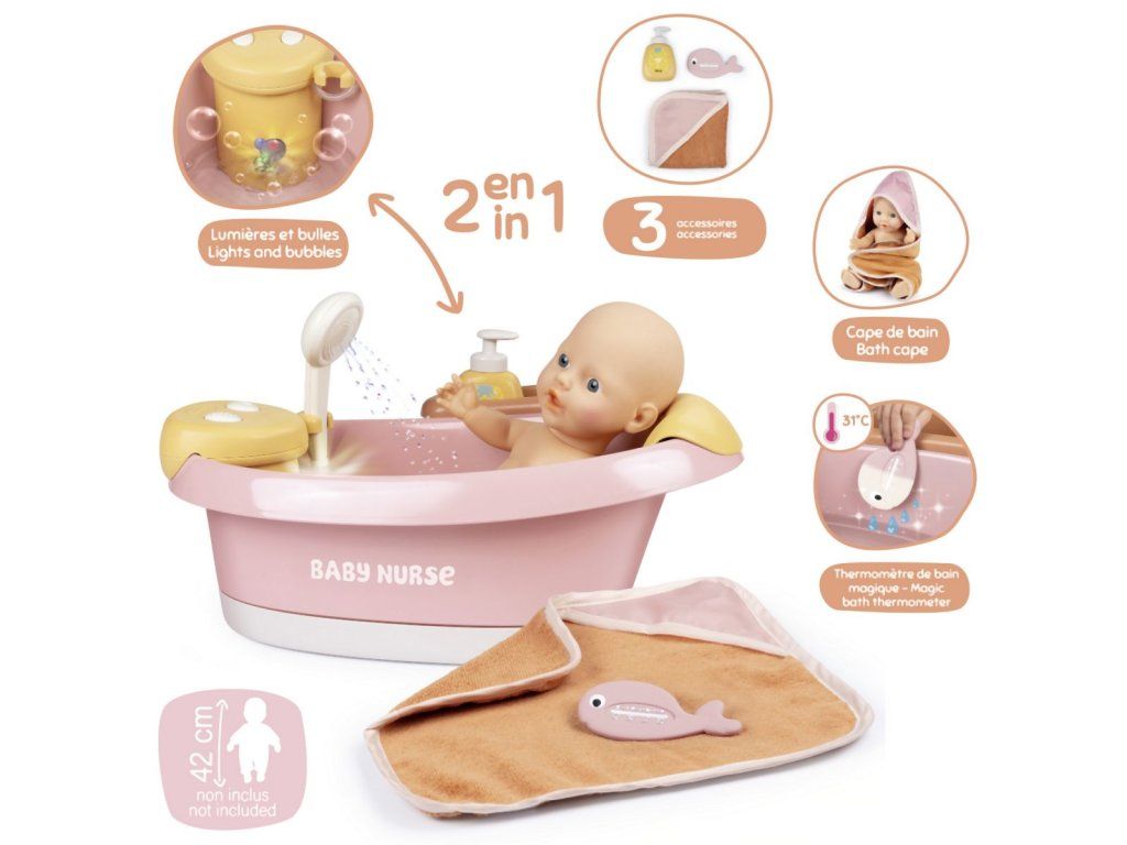 Vanička s opierkou hlavy pre bábiky Smoby Baby Nurse s elektronickou sprchou a bublinkovou funkciou so svetlom. Z automatickej sprchovej hlavice vytečie skutočná voda jednoduchým stlačením tlačidla. Vaňa má elektronický modul s 2 funkciami: uzavretý okruh vodnej trysky a bublifuk so svetlom. Polička ponúka dostatok miesta na uloženie vloženého príslušenstva: osušky z bavlneného froté, fľaštičky na šampón s pumpovacou funkciou a teplomeru v tvare veľryby. Teplomer je citlivý na teplo, pri kontakte s vodou mení farbu. Vhodné pre bábiky do 42 cm. Bábika nie je súčasťou balenia. Rozmery (DxŠxV): 40 x 30 x 23 cm.Dodatočné parametre