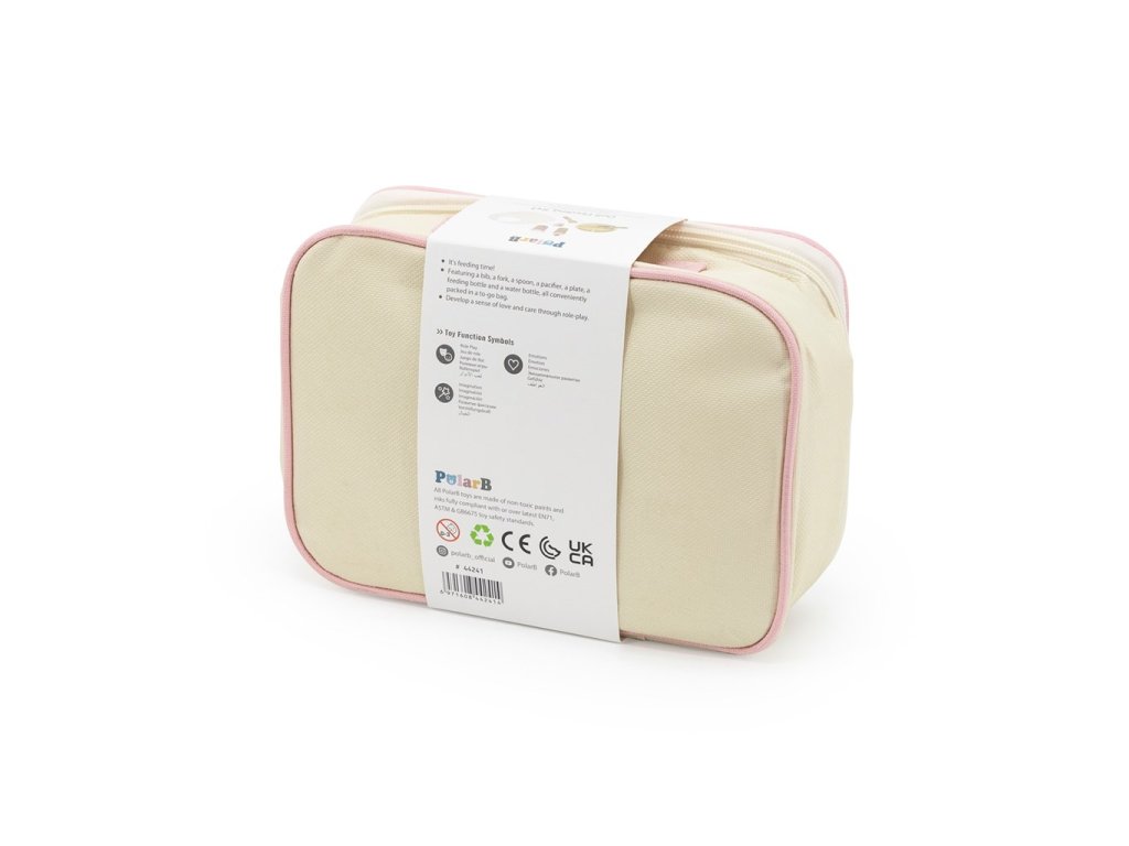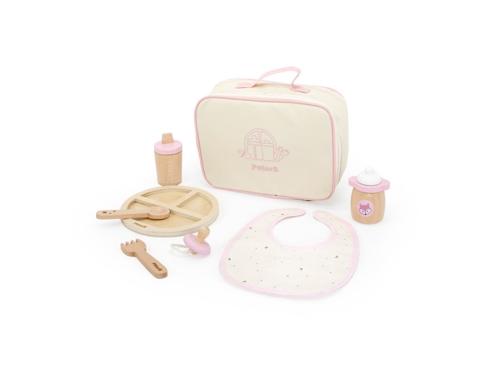 V súprave sa nachádza: podbradník, vidlička, lyžička, cumlík, tanierik, fľaša na kŕmenie a fľaša s vodou – všetko prehľadne zabalené v textilnom organizéri.