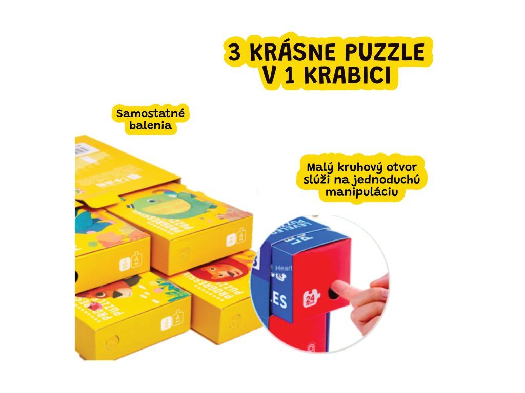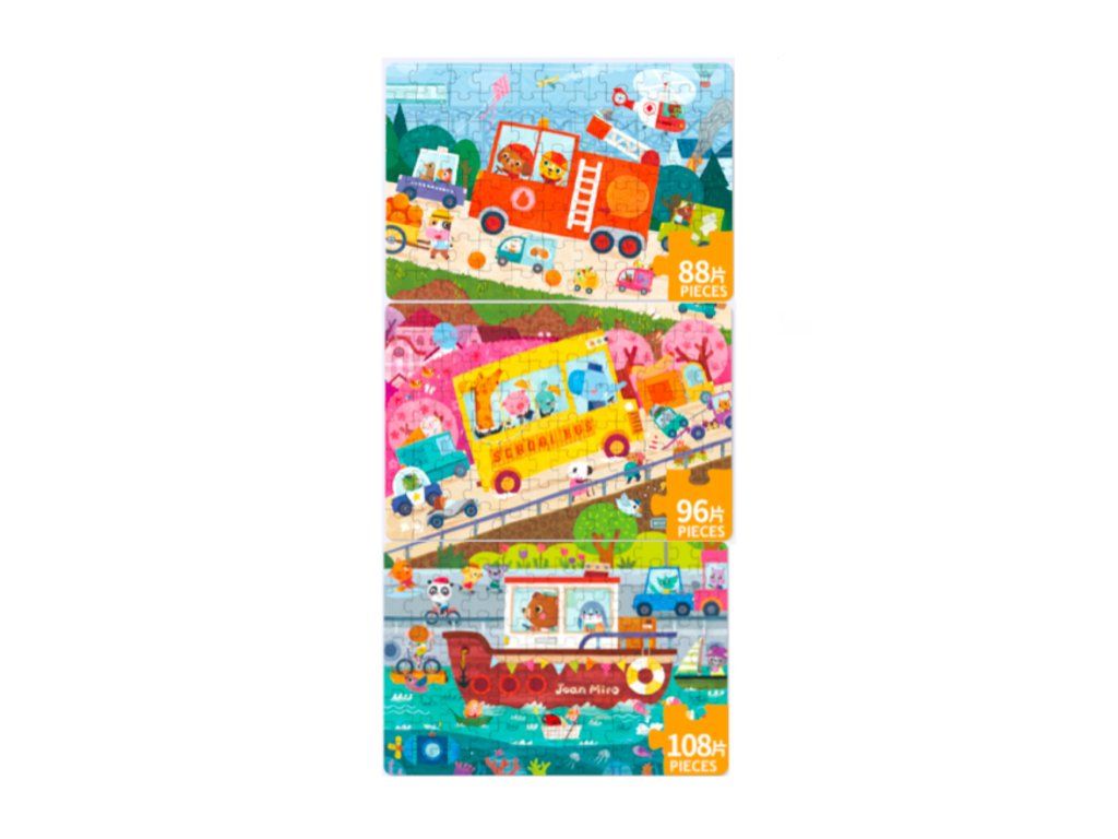 Puzzle Beep! Na ceste 3v1 Tri zábavné skladačky - jedna dobrodružná cesta plná vozidiel Vydaj sa s deťmi na cestu plnú zvieratiek a dopravných prostriedkov! Séria troch puzzle v jednom balení ponúka ideálnu výzvu pre malých skladateľov – od jednoduchšej po zložitejšiu. Ilustrovaný príbeh navyše rozvíja fantáziu a robí z hry nezabudnuteľný zážitok.Prečo je Puzzle Beep výnimočné? 3 v 1 puzzle (88 + 96 + 108 dielikov), ideálne pre rôzne úrovne zručnosti Knižka príbehov v anglickom jazyku rozširuje skladanie o vizuálne rozprávanie a slovnú zásobu Podporujú jemnú motoriku, pamäť, sústredenosť aj tímovú hru rodič–dieťa Bezpečné a odolné materiály, doporučené pre deti od 4 rokov, ľahké skladovanie v pevnom boxeDodatočné parametre