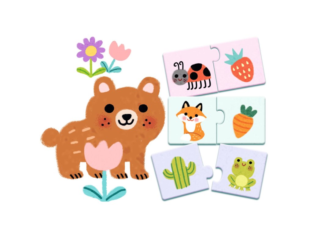Puzzle sú navrhnuté ako autokorekčné: správne dvojice do seba pekne zapadnú, nesprávne kombinácie väčšinou „nesedia“. Vďaka hrubému kartónu sa dieliky dobre držia v malých ručičkách a aktivita je ideálna aj na krátke hranie – doma, u starých rodičov či na cestách.