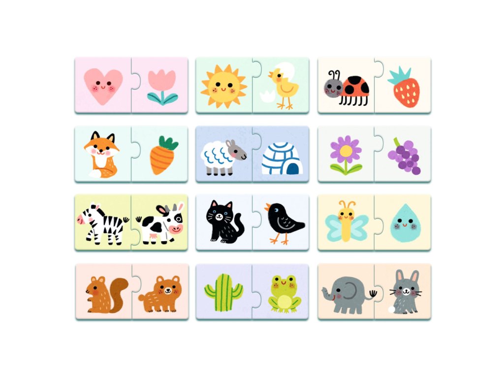 Puzzle Duo Farby je edukačné párovacie puzzle značky Djeco, ktoré pomáha deťom prirodzene spoznávať farby. Dieťa vždy spojí 2 dieliky tak, aby k sebe patrili nielen tvarom, ale najmä rovnakou farbou – napríklad zvieratko a predmet v rovnakom odtieni.