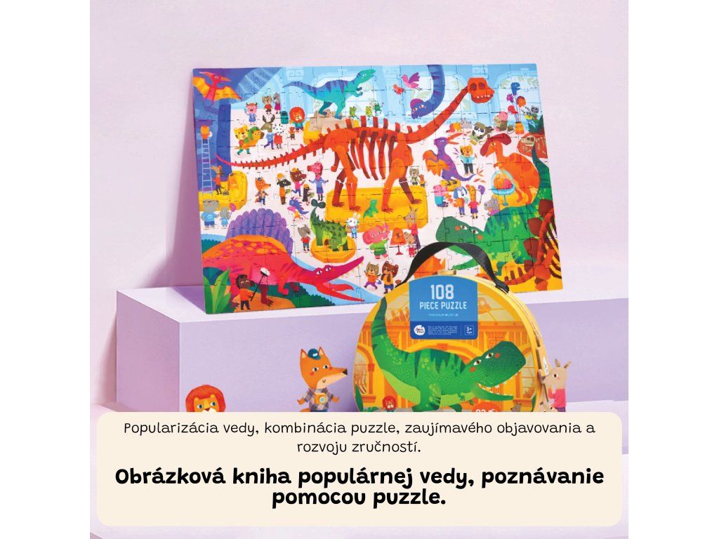 Puzzle Múzeum dinosaurov 108 ks Skúste poskladať s deťmi tajomný svet dinosaurov Tieto puzzle ponúkajú veľký obraz zložený zo 108 dielikov, uložených v praktickom kufríku. Po dokončení skladačky čaká deti veselé múzeum plné farieb a rôznych druhov dinsaurov. Hra ideálna na rozprávanie príbehov. Prečo sú tieto puzzle skvelou voľbou pre deti? 108 farebných dielikov vytvára veľký obraz múzea – ideálne pre deti od 3 rokov Dodávané v kufríku s madlom, jednoduché prenášanie a skladanie - skvelé na domáce využitie alebo ako zábavná aktivita na cestySilné kartónové dielikyPuzzle podporujú jemnú motoriku, trpezlivosť a koncentráciu Skvelé ako darček – nevyžaduje dosku ani povrchDodatočné parametre