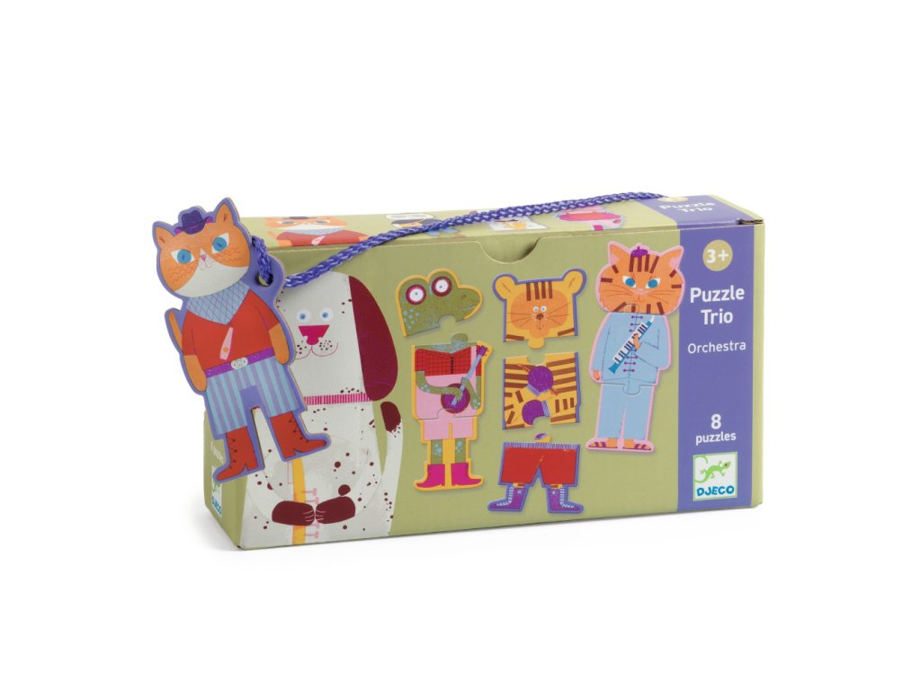 Puzzle Trio Orchester je edukačné puzzle značky Djeco, v ktorom deti skladajú zvieratká – hudobníkov z 3 dielikov. Každá postavička sa skladá zvisle (hlava–telo–nohy), takže dieťa prirodzene chápe, čo kam patrí, a pritom si trénuje pozornosť aj presnosť.