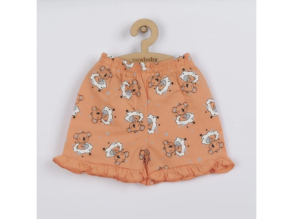 Dievčenské bavlnené pyžamko New Baby Dream s medvedíkom. Letné pyžamko sa skladá z trička s krátkym rukávom a kraťasov. Tričko s volánikmi zdobí na prednej strane roztomilý obrázok medvedíka na obláčiku a hviezdičky. Zapínanie na ramienku na cvočky. Kraťasy sú celopotlačené medvedíkmi a na nohavičkách majú roztomilé volániky. V páse je širší lemom s gumičkou, ktorý netlačí na bruško bábätka. Vhodné aj ako detské letné oblečenie. Zloženie: 100% bavlna.Dodatočné parametre