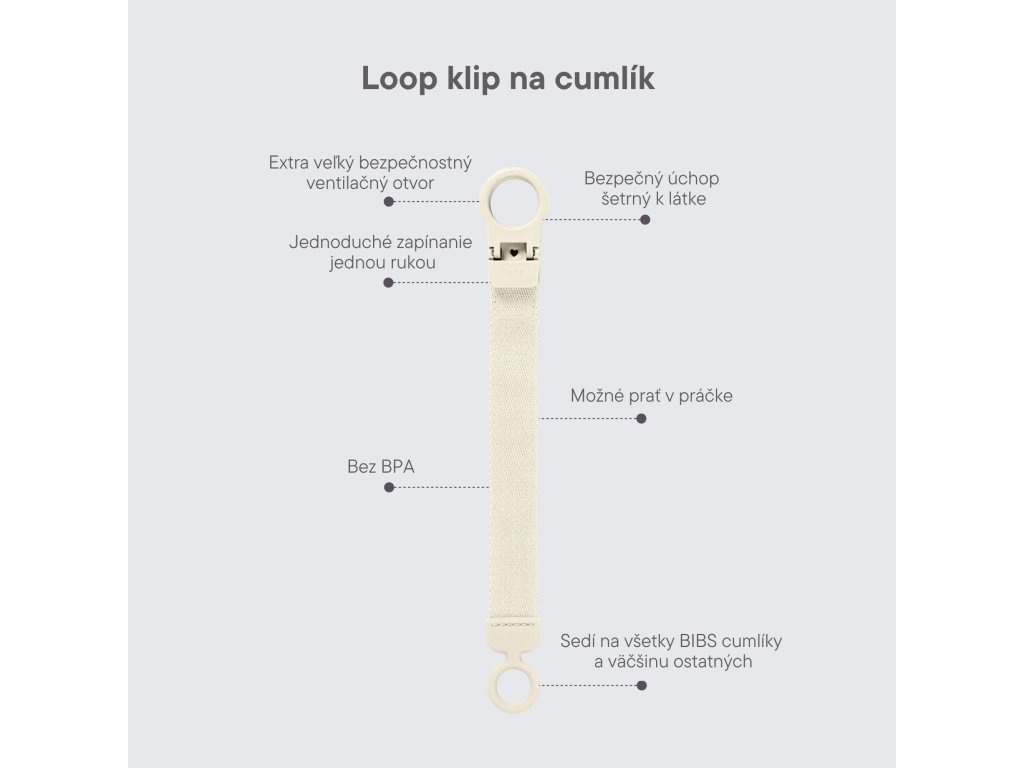 BIBS je obľúbená dánska značka s tradíciou výroby ikonických cumlíkov od roku 1978. Okrem cumlíkov BIBS ponúka aj pestrý prémiový sortiment pre najmenšie deti v minimalistickom škandinávskom dizajne a širokej farebnej palete. Všetky BIBS produkty sú garanciou najvyššej kvality detského sortimentu.Klip na cumlík je praktickou súčasťou modernej detskej výbavičky. Svoje využitie si nájde v domácom prostredí, vonku, v autosedačke, pri hre alebo počas prechádzky a zabezpečí, že je cumlík vždy po ruke, zostane čistý, nespadne na zem alebo sa nestratí.Loop klipy od BIBS majú jedinečný systém zapínania jednou rukou. Sú vhodné pre všetky druhy cumlíkov BIBS a väčšinu iných značiek. Rodičia, ktorí chcú skombinovať dizajn a funkčnosť, si klipy ľahko farebne doladia s obľúbenými cumlíkmi a slintáčikmi BIBS. Jedinečný mechanizmus na zapínanie jednou rukou. Bezpečné uchytenie šetrné k oblečeniu. Odolný popruh z kvalitnej polyesterovej tkaniny. Krúžok z potravinárskeho silikónu. Klip na uchytenie z pevného a odolného polyméru bez BPA. V súlade s európskou normou EN 12586+A1:2011. Čistenie:Klip môžete prať ručne alebo v práčke pri 30°C. Po opratí nechajte dôkladne vyschnúť.Použitie:Klip na cumlík by sa mal používať, keď je vaše dieťa bdelé a pod dohľadom. Môže byť pripevnený iba k odevu. Nemal by sa používať, keď je dieťa v postieľke ani počas spánku. Nesmie sa používať ako hračka ani hryzátko. Neviažte ho okolo krku svojho dieťaťa a nepoužívajte, keď je dieťa bez dozoru. Pred každým použitím starostlivo skontrolujte. Pri prvom náznaku poškodenia alebo oslabenia vyhoďte. Nikdy nepredlžujte. Nikdy nepripínajte na stuhy, šnúrky alebo voľné časti odevu.Dodatočné parametre