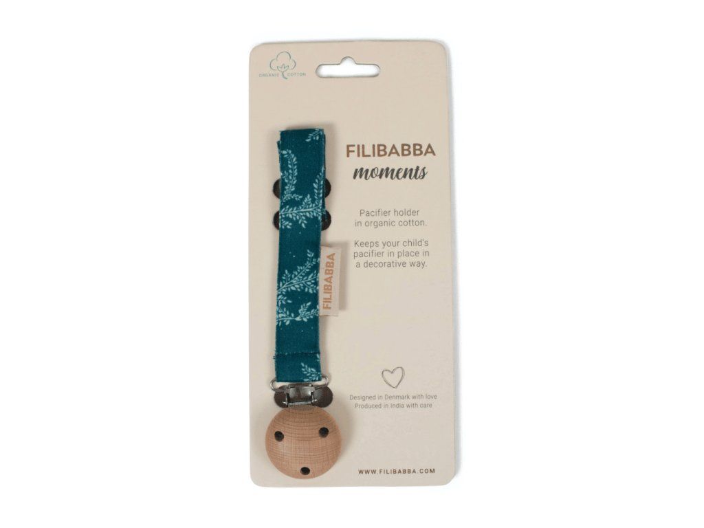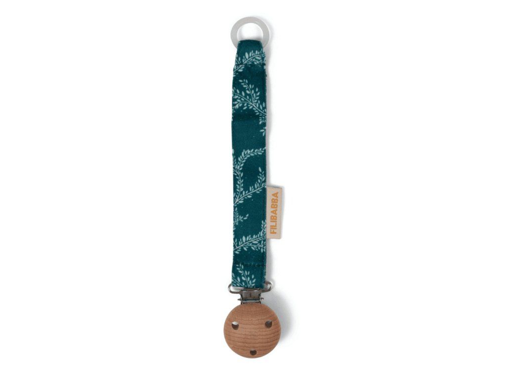 Ľahučký klip na cumlík z organickej bavlny, s detailmi v trendy jesenných farbách, dreveným gombíkom, kovovou sponou a silikónovým krúžkom.