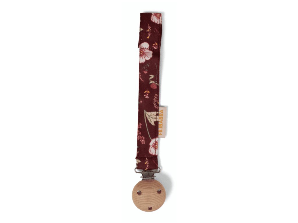 Ľahučký klip na cumlík z organickej bavlny, s detailmi v trendy jesenných farbách, dreveným gombíkom, kovovou sponou a suchým zipsom na prichytenie cumlíku.