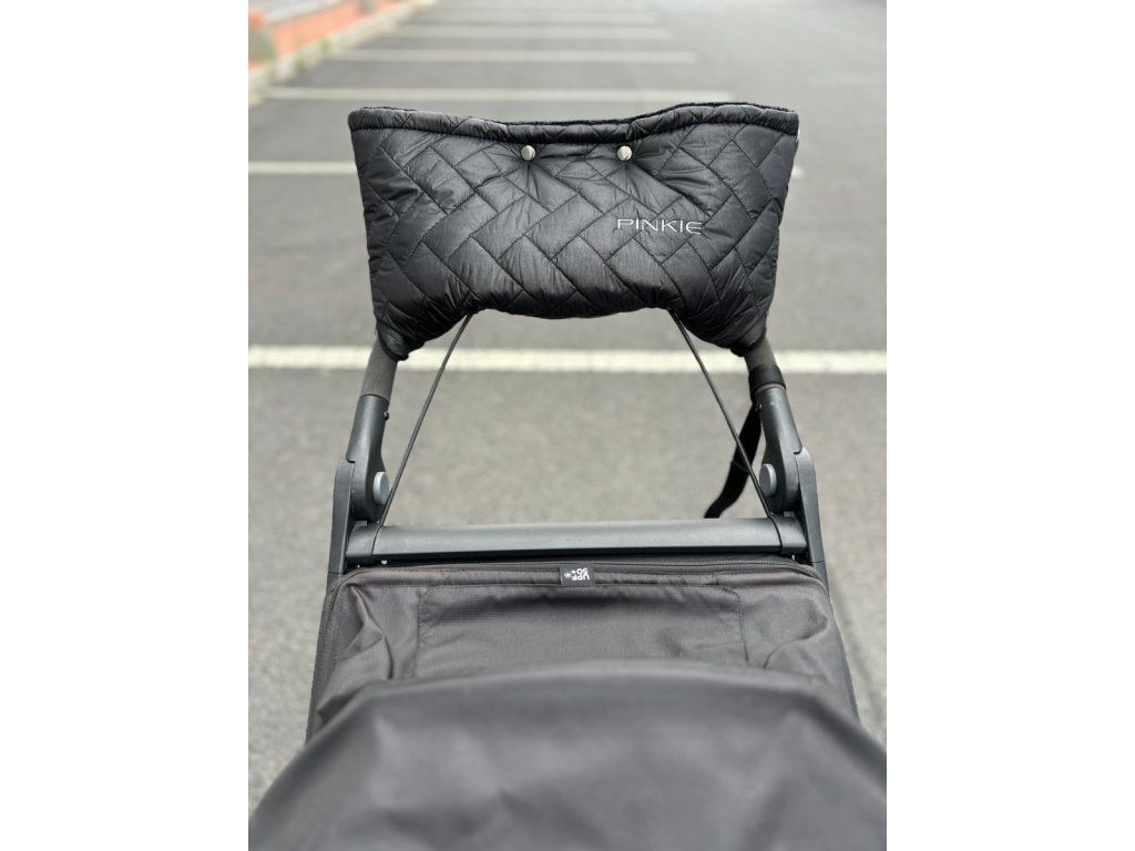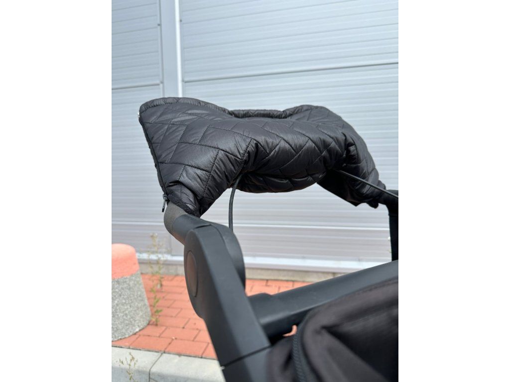 Rukávnik vytvorený priamo na madlo Thule.Aby dobre sedel a neprekážali mu lanká od brzdy, sú vytvorené na rukávniku prestrihy, ktoré sa po pripnutí na madlo zafixujú suchým zipsom.