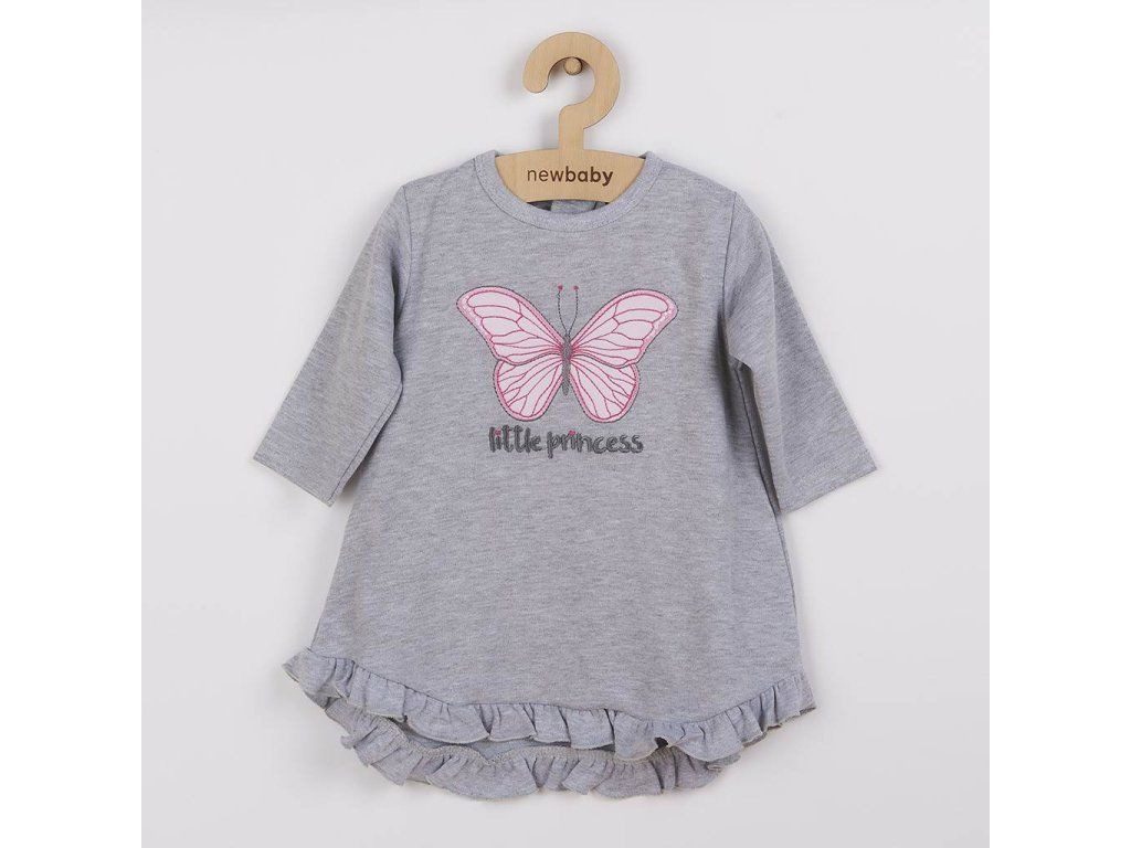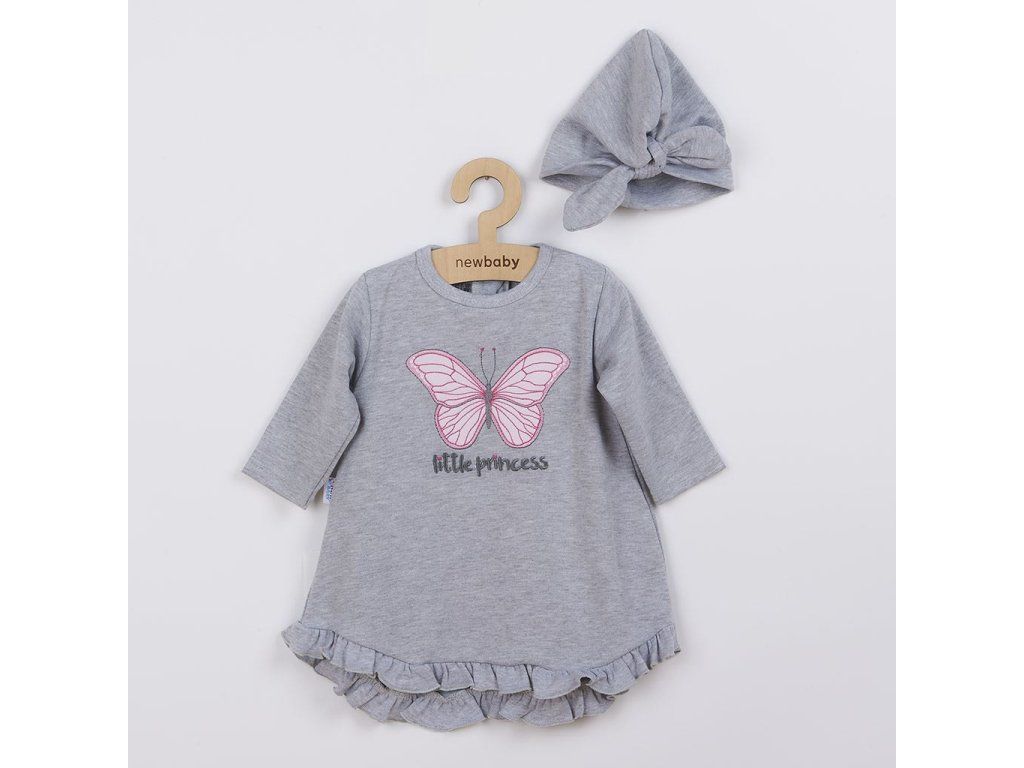 Dojčenské šatôčky s čiapočkou-turban New Baby Little Princess. Šatôčky Áčkového strihu sú vhodné na jarné i jesenné obdobie, vďaka príjemnej bavlne. Sú zdobené krásnou výšivkou motýlika, nápisom little princess a volánikom v spodnej časti šiat. Výšivka je podlepená proti poškriabaniu. Zadná časť šiat je mierne predĺžená. Zapínanie je na krčku na zadnej strane na cvoček. Zloženie: 100% bavlna.Dodatočné parametre