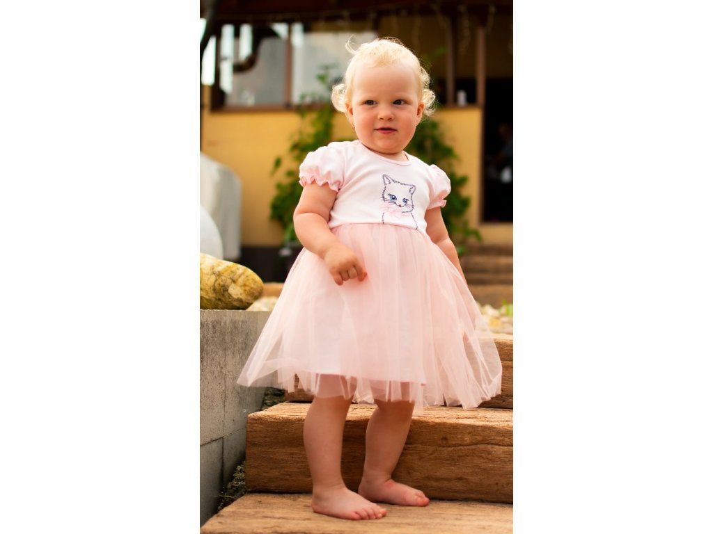 Dojčenské šatičky s tylovou sukienkou New Baby Wonderful. Šatôčky moderného strihu majú nádherne nariasené balónkové rukávy a zapínanie majú na ramienku na cvočky. Sú zdobené roztomilou výšivkou mačičky. Výšivka je podlepená látkou proti poškriabaniu. Spodnú bavlnenú časť zdobí nariasená tylová suknička. Dychberúce, krásne prepracované z veľmi príjemnučkého materiálu kúzelné šatôčky. Zloženie: šaty: 100% bavlna, tylová suknička: 100% polyester.Dodatočné parametre