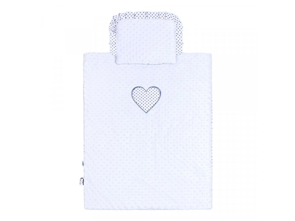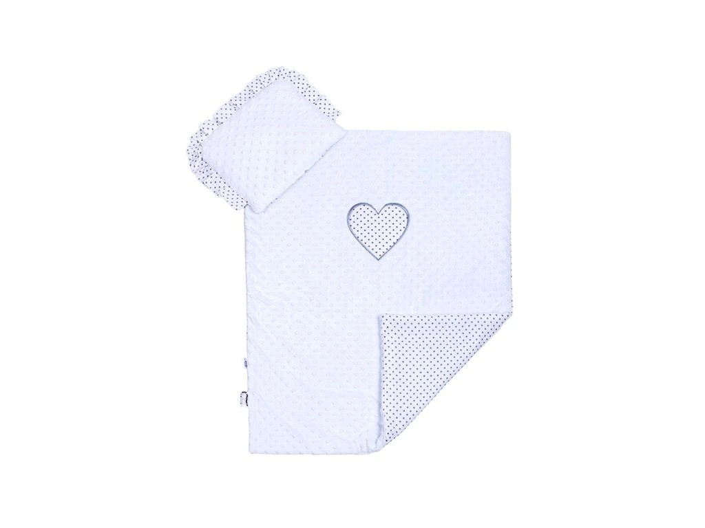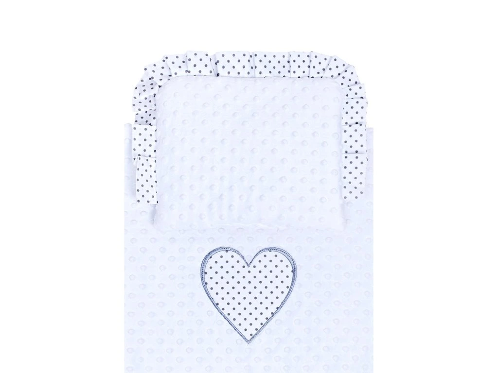 Obojstranný set z Minky New Baby do kočíka. Z jednej strany je Minky materiál a z druhej strany bavlnená látka celopotlačená bodkami. Set obsahuje vankúšik, ktorý je zdobený volánikom a prikrývku, ktorá má na strane Minky, našité krásne veľké bodkované srdiečko. Kladieme dôraz na kvalitu a preto sú perinky do kočíka ušité z veľmi kvalitného materiálu, ktorý nepúšťa farbu a nevyvoláva alergické reakcie. Všetko je vyplnené antialergickým vláknom. Zloženie: povlak 100% bavlna, 100% polyester, výplň 100% polyester. Rozmery: vankúšik: cca 25x32 cm, perinka: cca 82x68 cm. Tieto výrobky sú bezpečné, pretože:-prírodná bavlna nespôsobuje odreniny a podráždenia, pretože neobsahuje formaldehydy a ďalšie prvky, ktoré dojčatám škodia