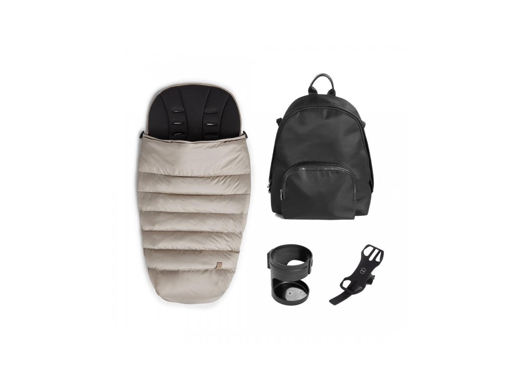 Sada doplnkov pre kočík Silver Cross Tide obsahuje luxusný fusak, štýlový prebaľovací batoh, držiak na nápoje a držiak na mobil.