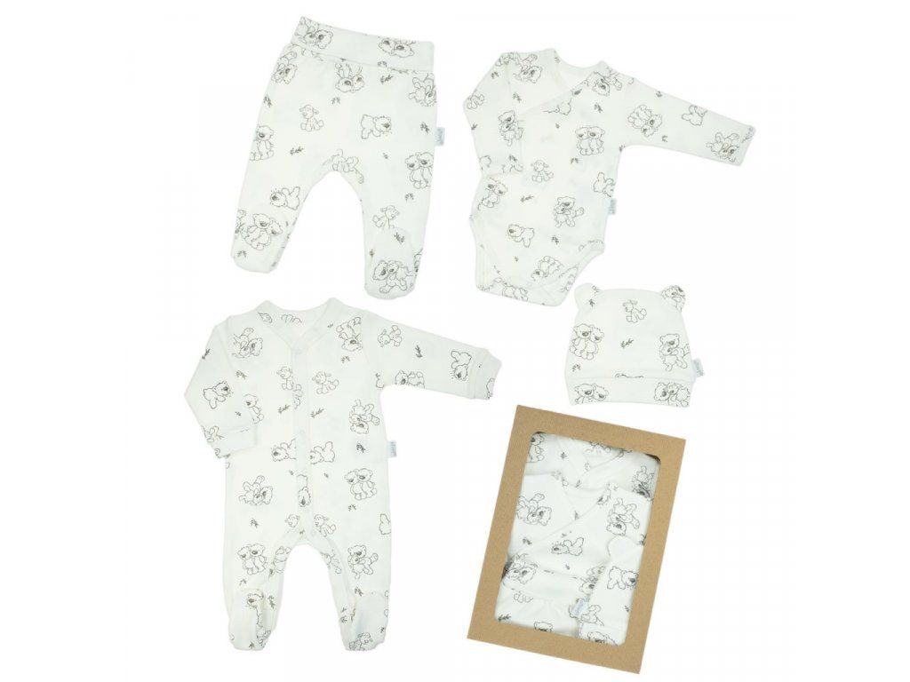 Roztomilá dojčenská 4-dielna súpravička Nicol Mackovia pre bábätká. Súpravička je vyrobená z veľmi príjemného mäkkého a kvalitného materiálu, ktorý je vhodný pre bábätká a je vhodná nielen do pôrodnice. Obsahuje celorozopínacie body s dlhým rukávom, overal, polodupačky a čiapočku. Celorozopínacie body a overal majú zapínanie na cvočky po celej dĺžke a medzi nožičkami. Čiapočka je krásne tvarovaná na ušká a dobre drží na hlavičke bábätka. Celá súpravička má nový dizajn s potlačou medvedíkov. V tejto súpravičke, ktorá je precízne a kvalitne ušitá sa bude bábätko cítiť veľmi príjemne. Je navrhnutá s ohľadom na potreby bábätka a je vhodná aj ako milý darček. Súpravička je v praktickej Eko krabičke. Zloženie: 100% bavlna.Dodatočné parametre