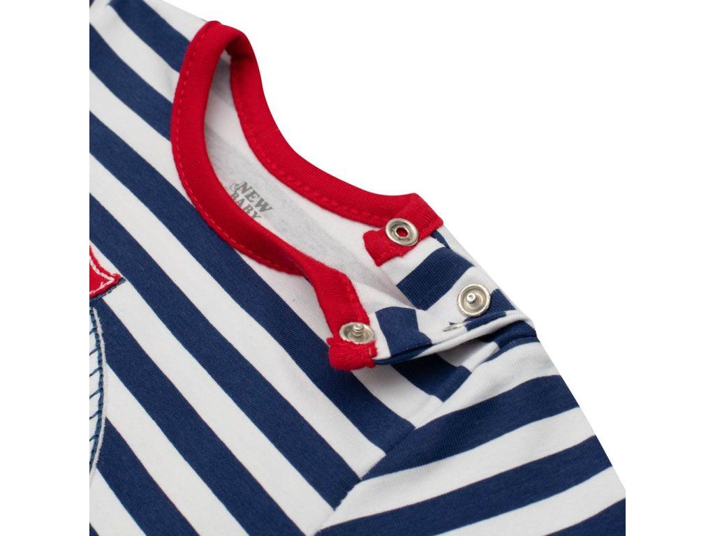 2-dielna letná bavlnená súpravička New Baby Marine. Súpravička obsahuje tričko a kraťasky. Tričko s krátkym rukávom s farebným lemovaním okolo krčku je zdobené krásnou nášivkou lodičky a je celopotlačené modernými pruhmi. Nášivka je podlepená látkou proti poškriabaniu. Tričko má zapínanie na ramienku pre ľahké obliekanie. Pohodlné kraťasky sú jednofarebné s malým obrázkom kotvy. Zloženie 100% bavlna.Dodatočné parametre