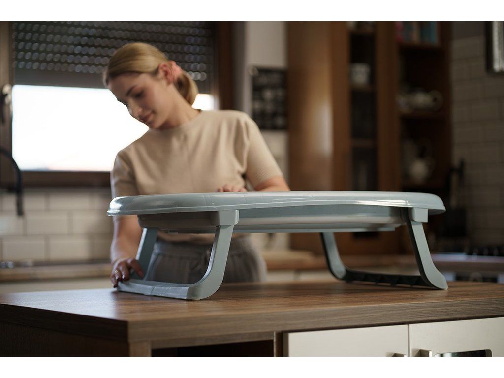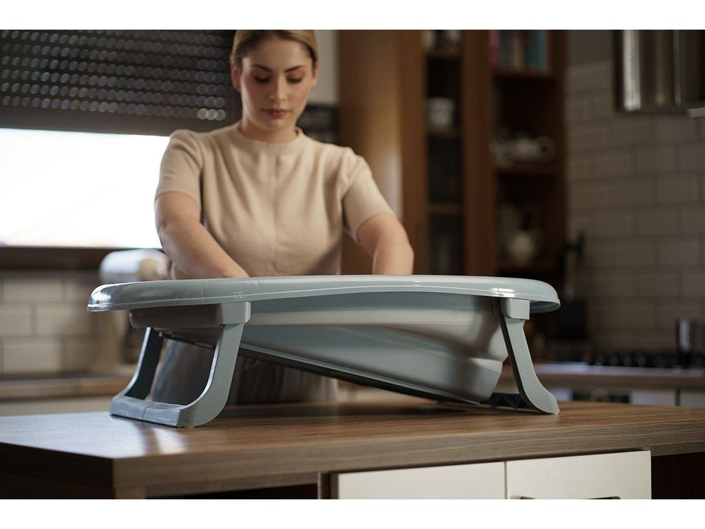 Vanička je vybavená výpustným ventilom a pásikovým teplomerom, čo výrazne zvyšuje komfort a bezpečnosť pri každodennom používaní. Dá sa jednoducho zložiť na výšku len 10 cm, pričom plastové nožičky sa sklopia priamo pod vaničku – vďaka čomu zaberá minimum miesta a je ideálna na skladovanie aj v menších priestoroch.